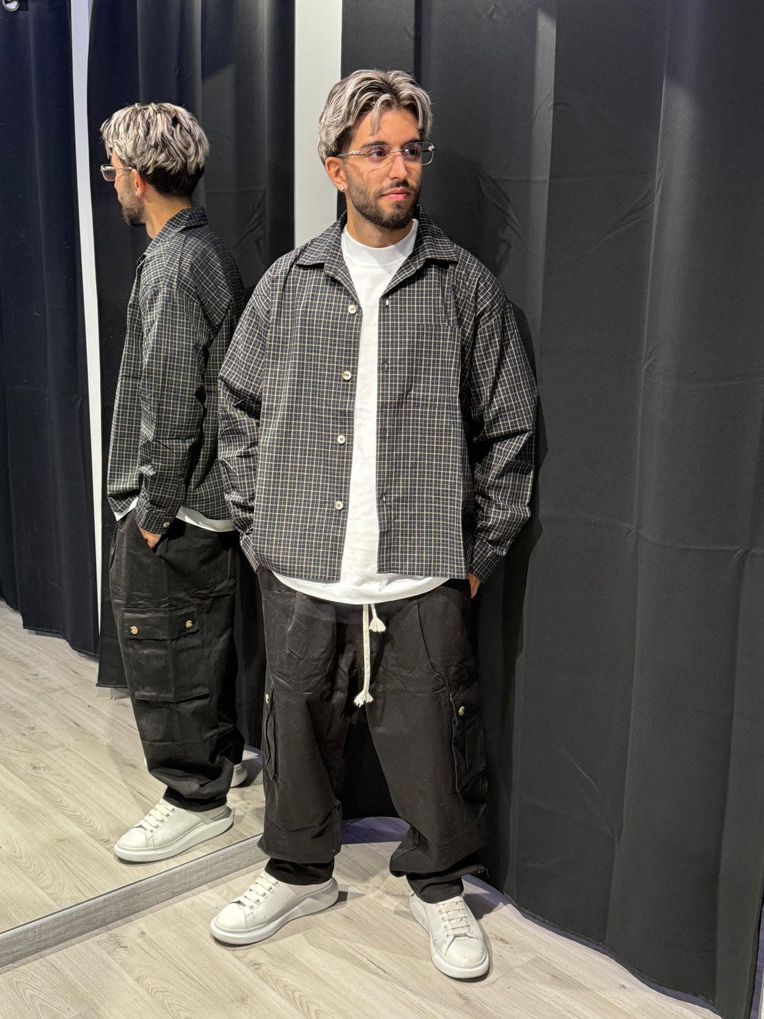 Camicia grigia a quadri in tessuto leggermente più pesante, perfetta come sovracamicia per le mezze...
