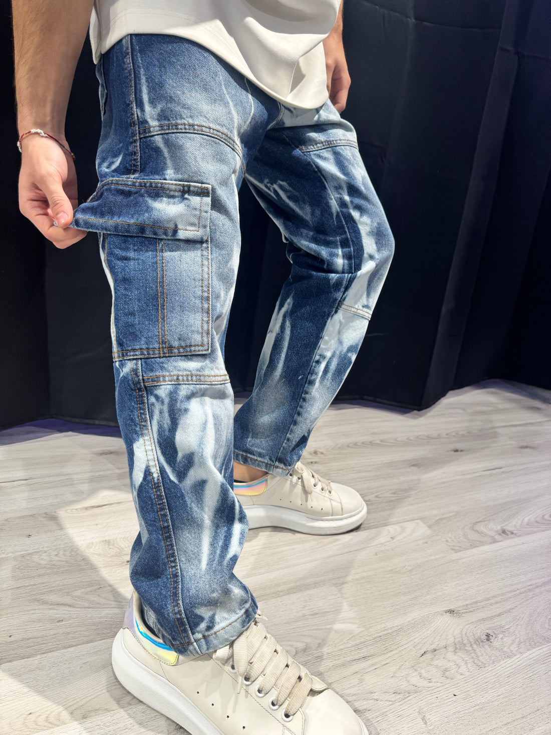 Jeans cargo point con un effetto unico che passa dal denim al bianco, creando un...