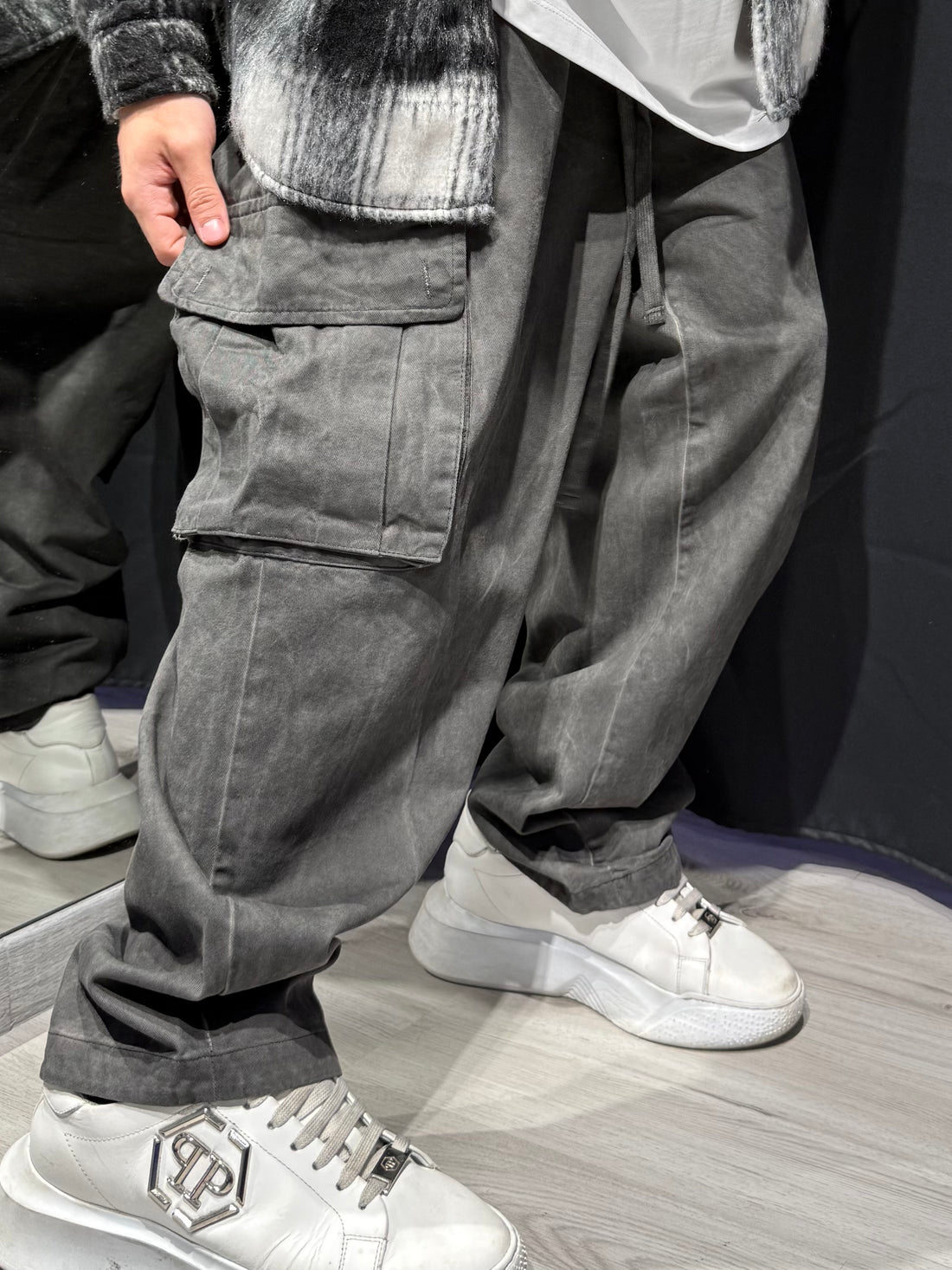 Un jeans baggy che parla da solo. Le sfumature intense dal nero al grigio creano...