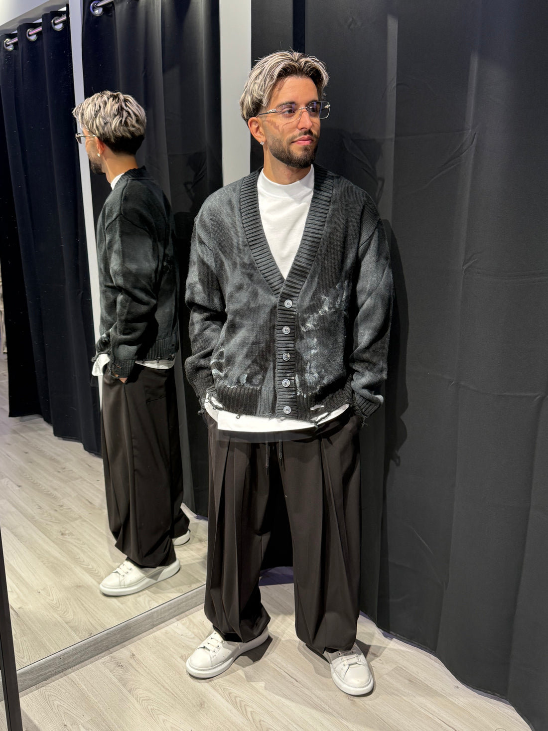 Cardigan sfrangiato con effetto sfumato dal nero al grigio: un capo unico che unisce comfort...