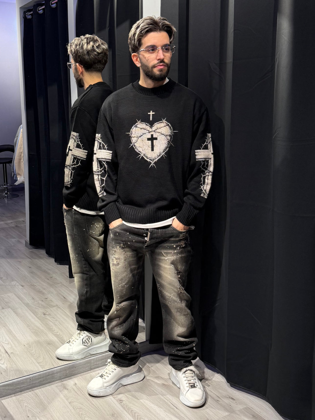 Maglione in morbida maglia premium con cuore e croce frontali e dettagli laterali sulle maniche...