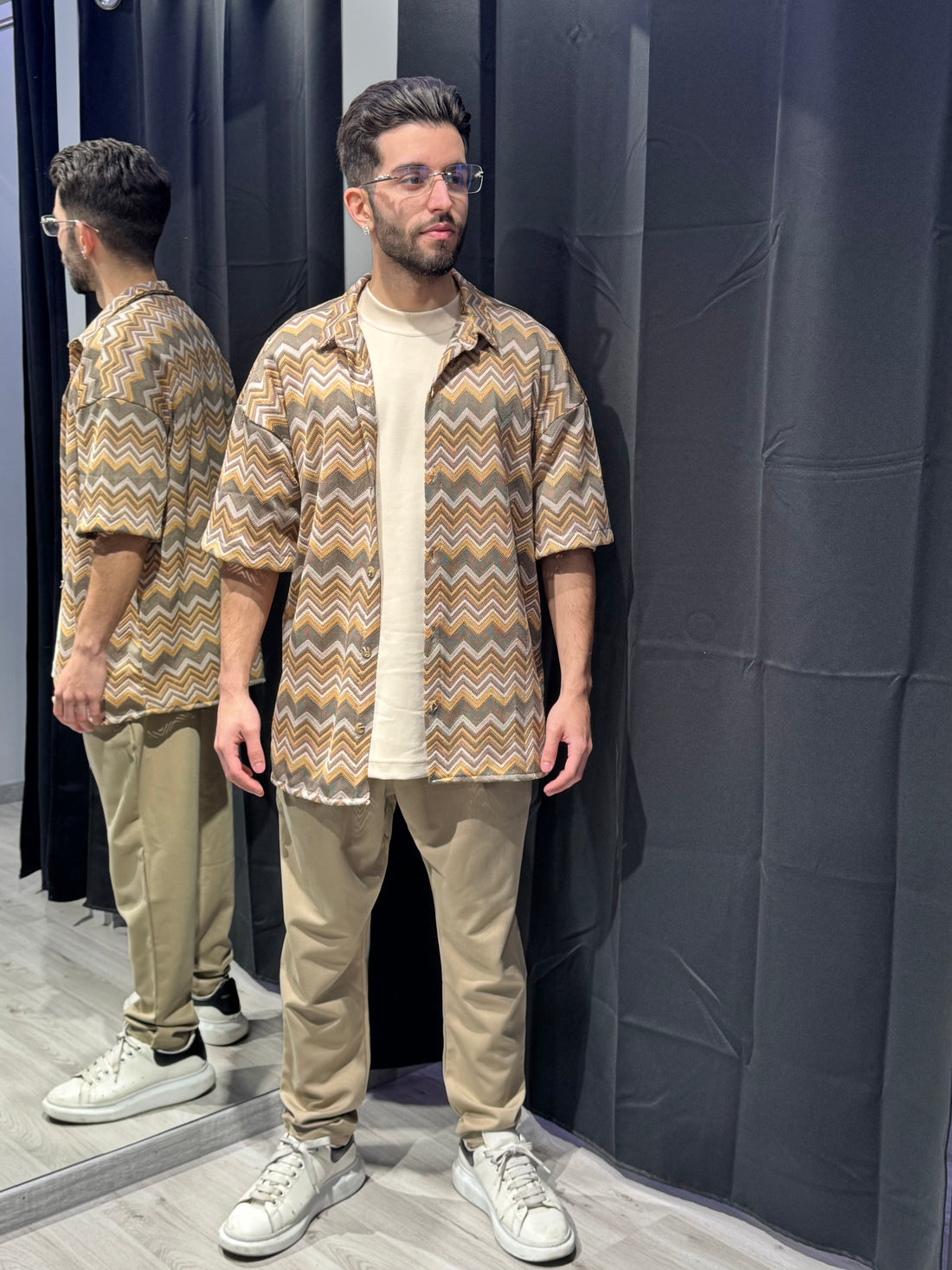 Un capo artistico e visivo.Linee a zig-zag percorrono l’intera camicia, creando un effetto visivo continuo,...