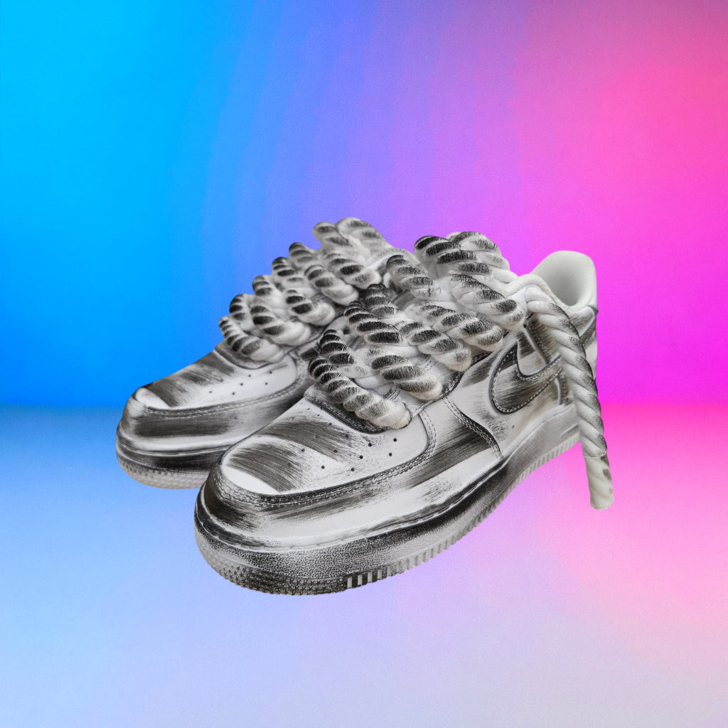 Questa sneaker parte da una base iconica — la Nike Air Force — e viene customizzata interamente a mano, con dettagli unici e lavorazioni artigianali che rendono ogni scarpa diversa da qualsiasi altra.