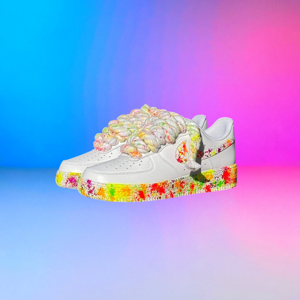 Questa sneaker parte da una base iconica — la Nike Air Force — e viene customizzata interamente a mano, con dettagli unici e lavorazioni artigianali che rendono ogni scarpa diversa da qualsiasi altra.