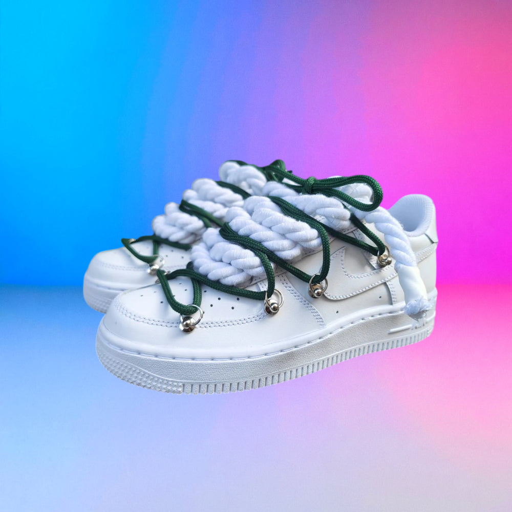Questa sneaker parte da una base iconica — la Nike Air Force — e viene customizzata interamente a mano, con dettagli unici e lavorazioni artigianali che rendono ogni scarpa diversa da qualsiasi altra.
