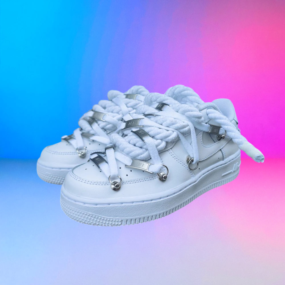 Questa sneaker parte da una base iconica — la Nike Air Force — e viene customizzata interamente a mano, con dettagli unici e lavorazioni artigianali che rendono ogni scarpa diversa da qualsiasi altra.