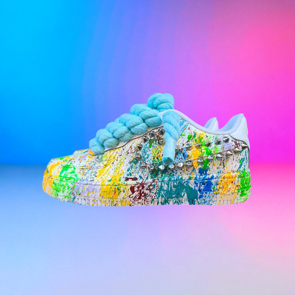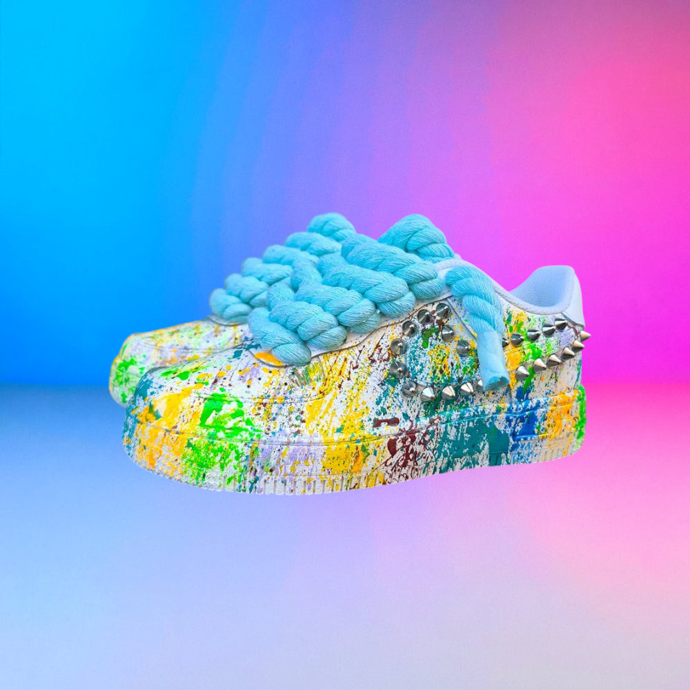 Questa sneaker parte da una base iconica — la Nike Air Force — e viene customizzata interamente a mano, con dettagli unici e lavorazioni artigianali che rendono ogni scarpa diversa da qualsiasi altra.