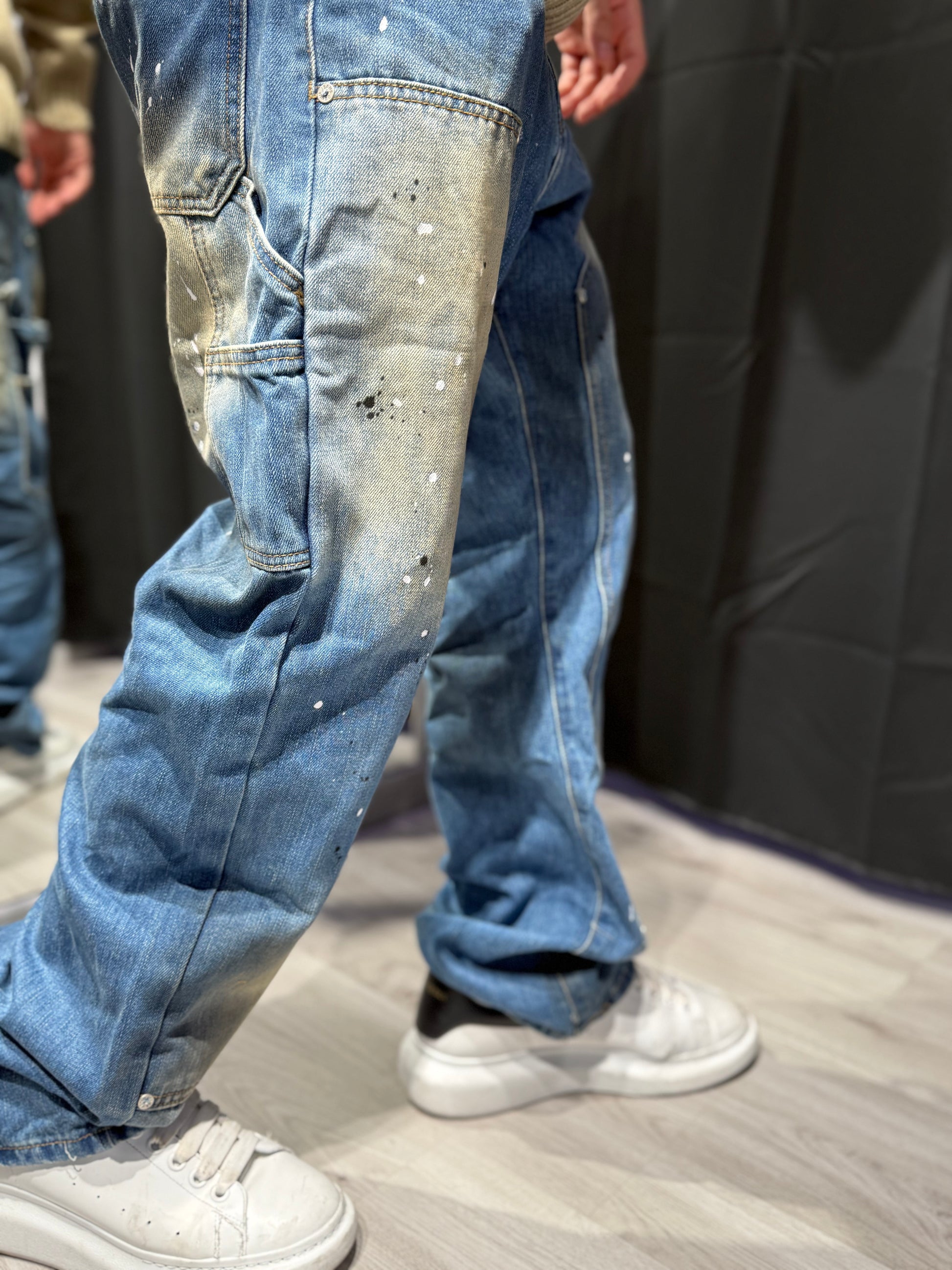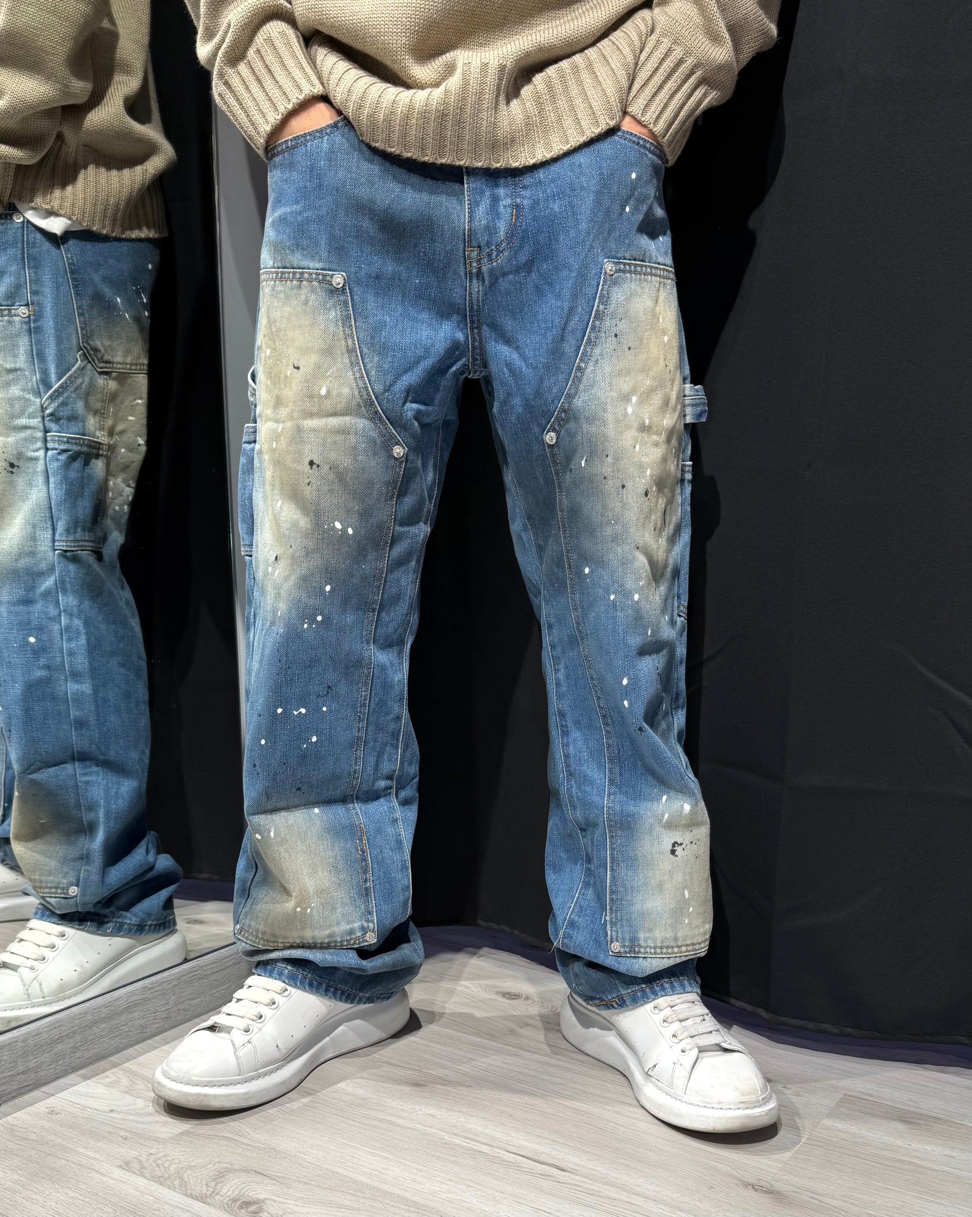 Realizzati in denim lavato, presentano sfumature beige e schizzi effetto vernice per un look vissuto e autentico.