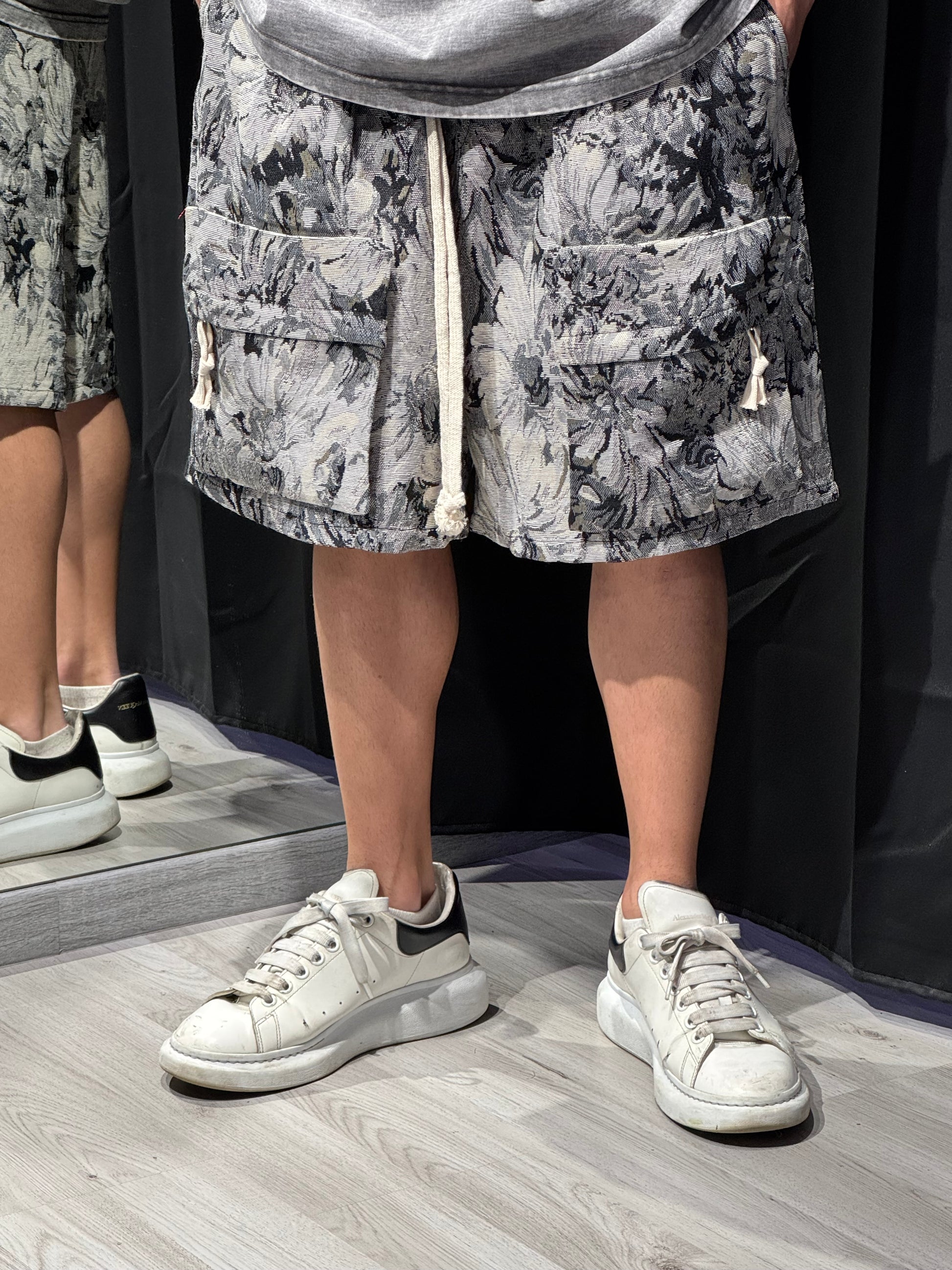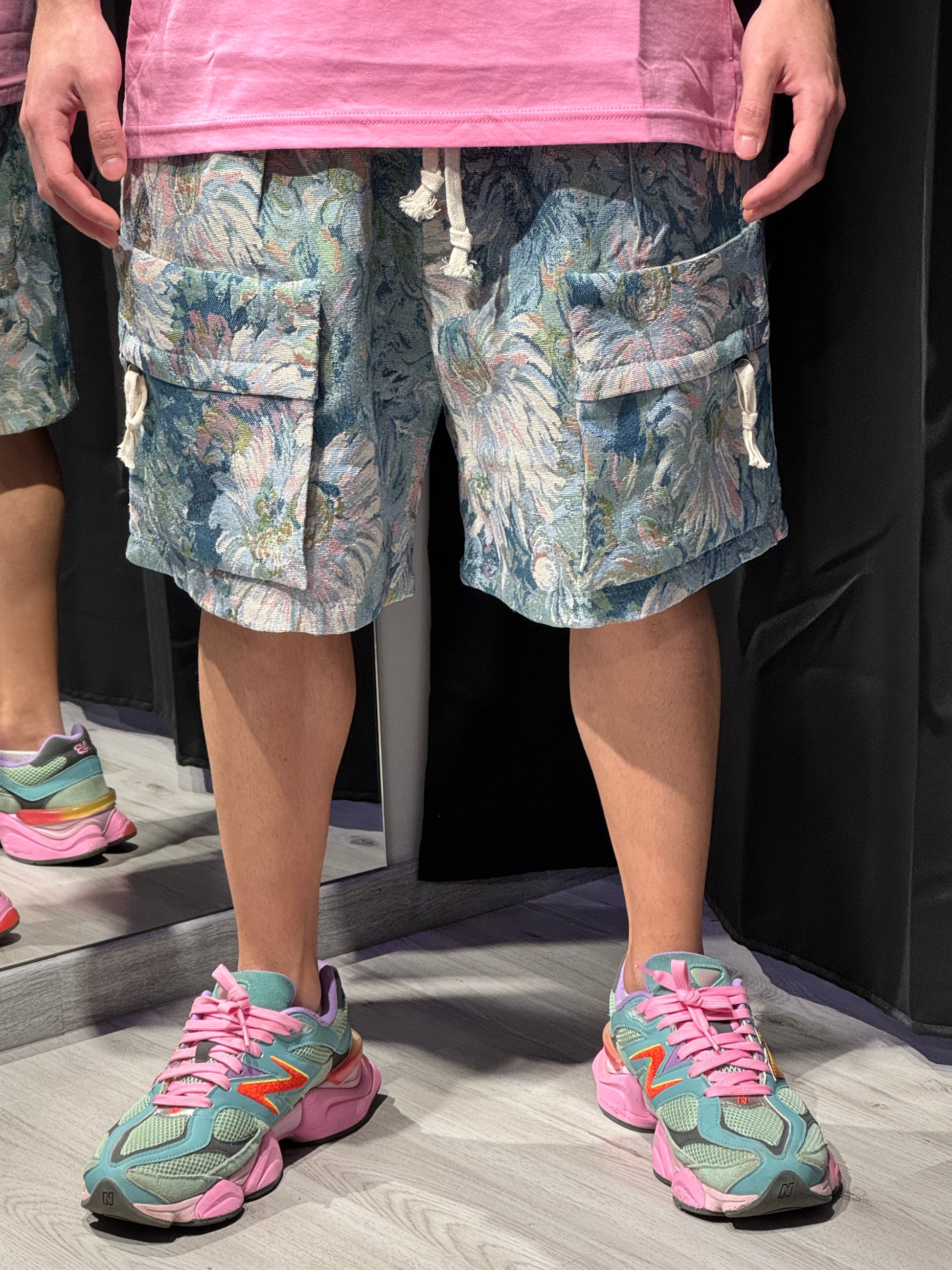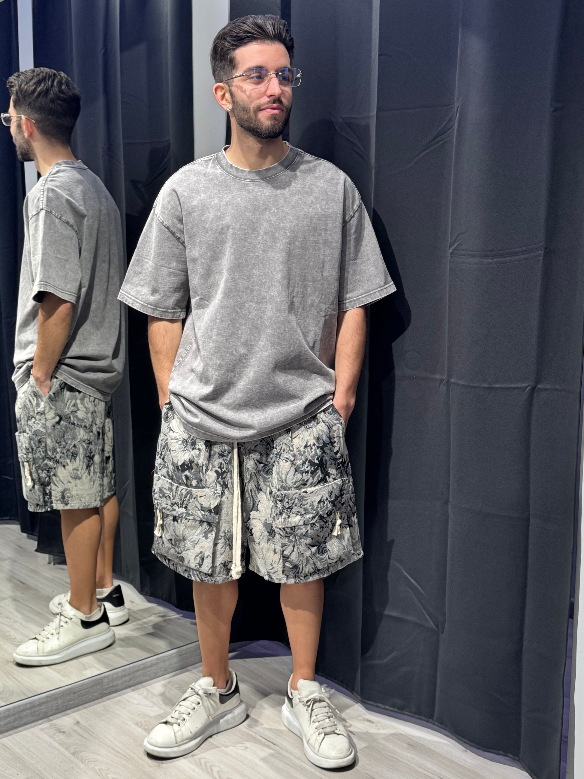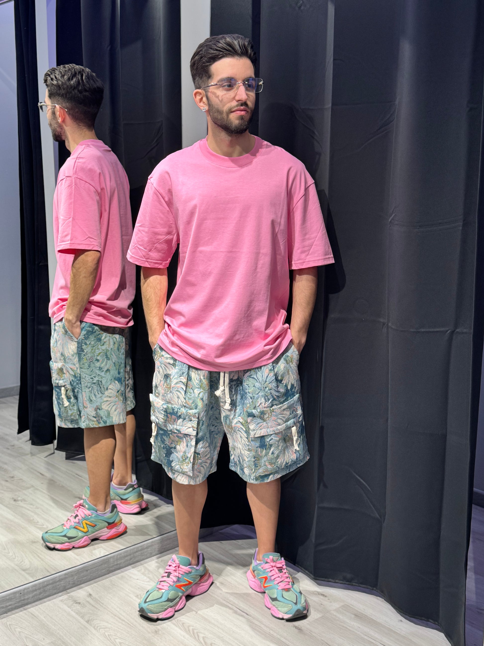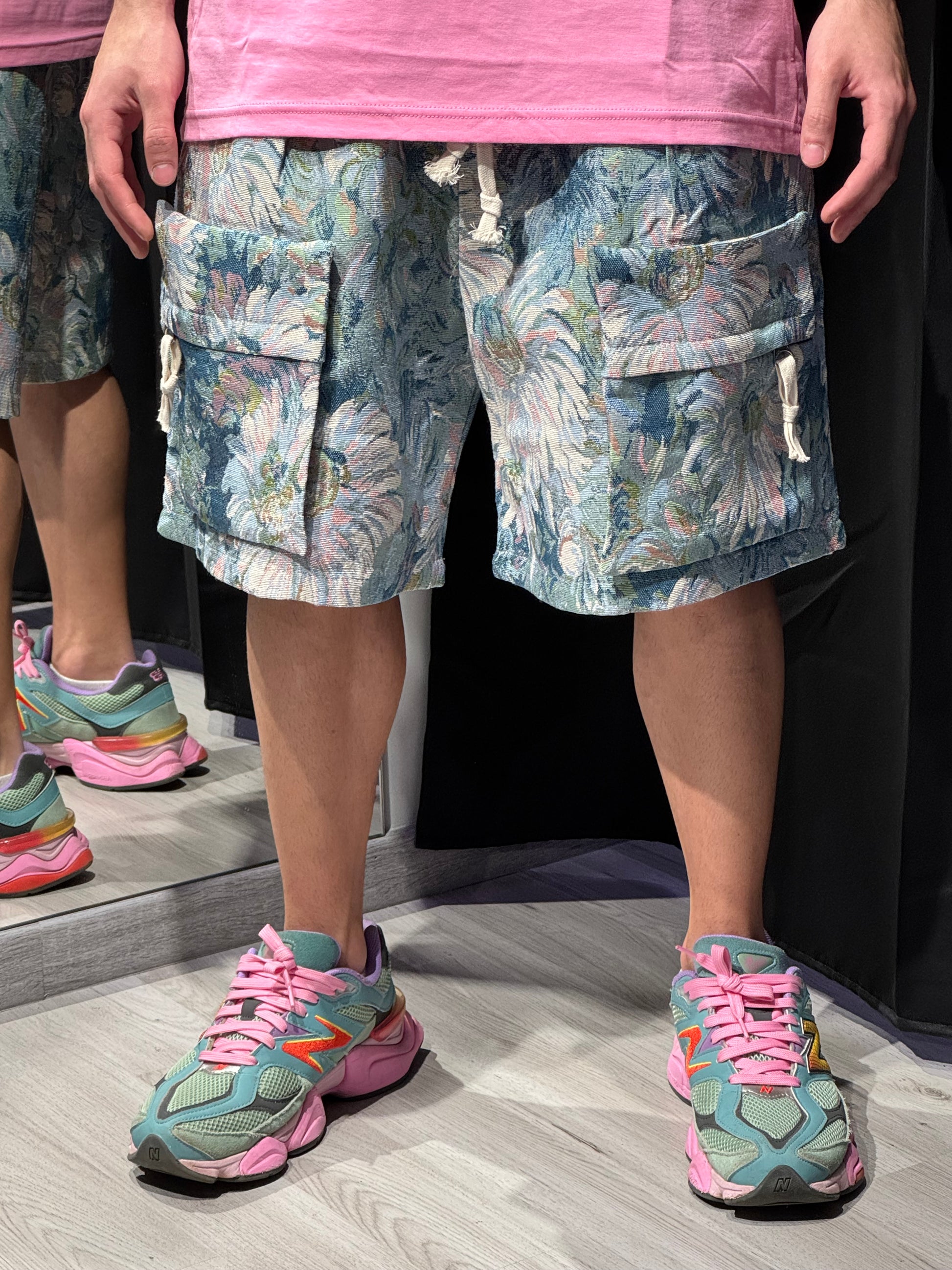 Bermuda con tasche frontali decorate da motivi floreali vivaci, perfetti per un look fresco e urban.
