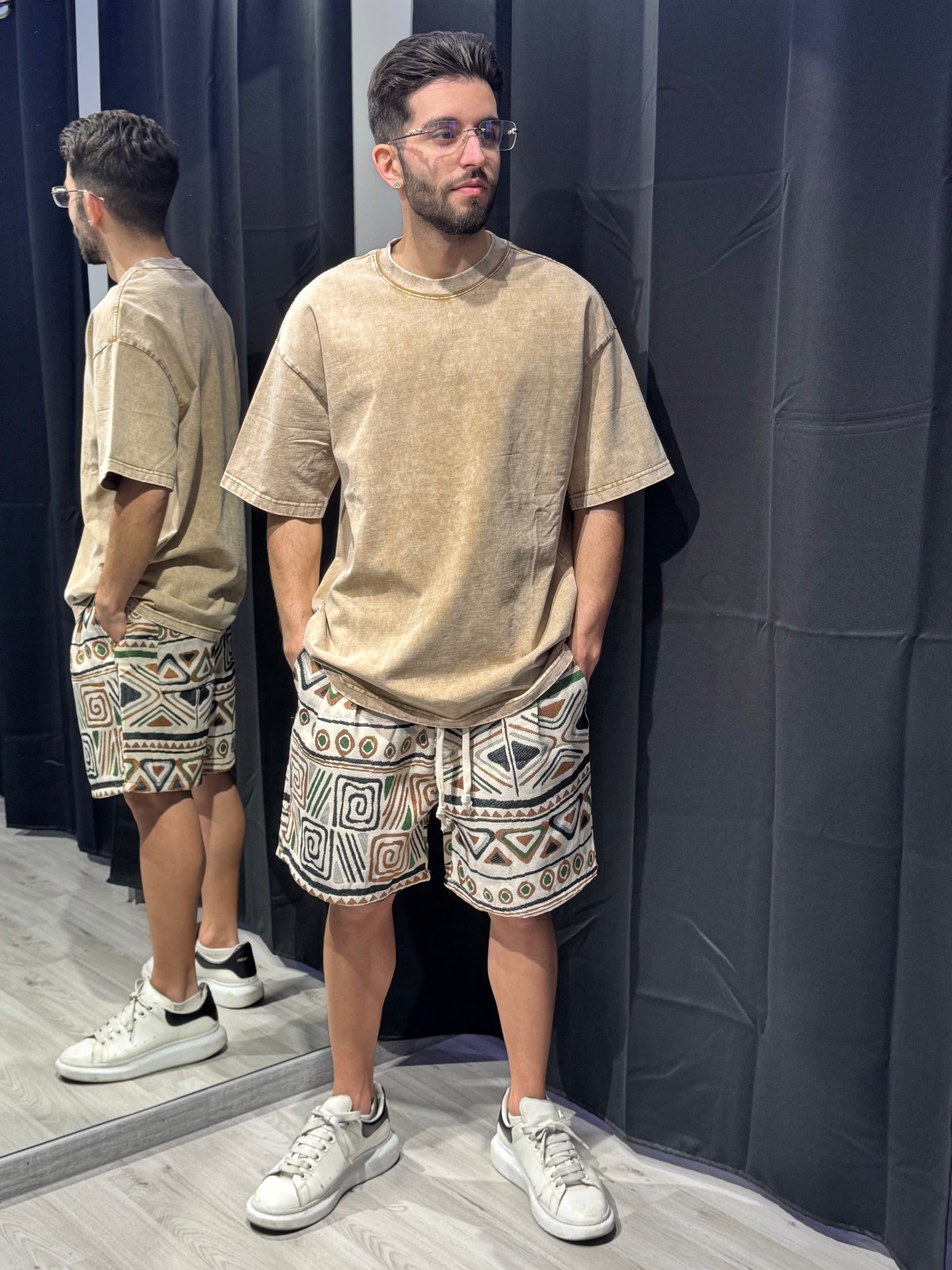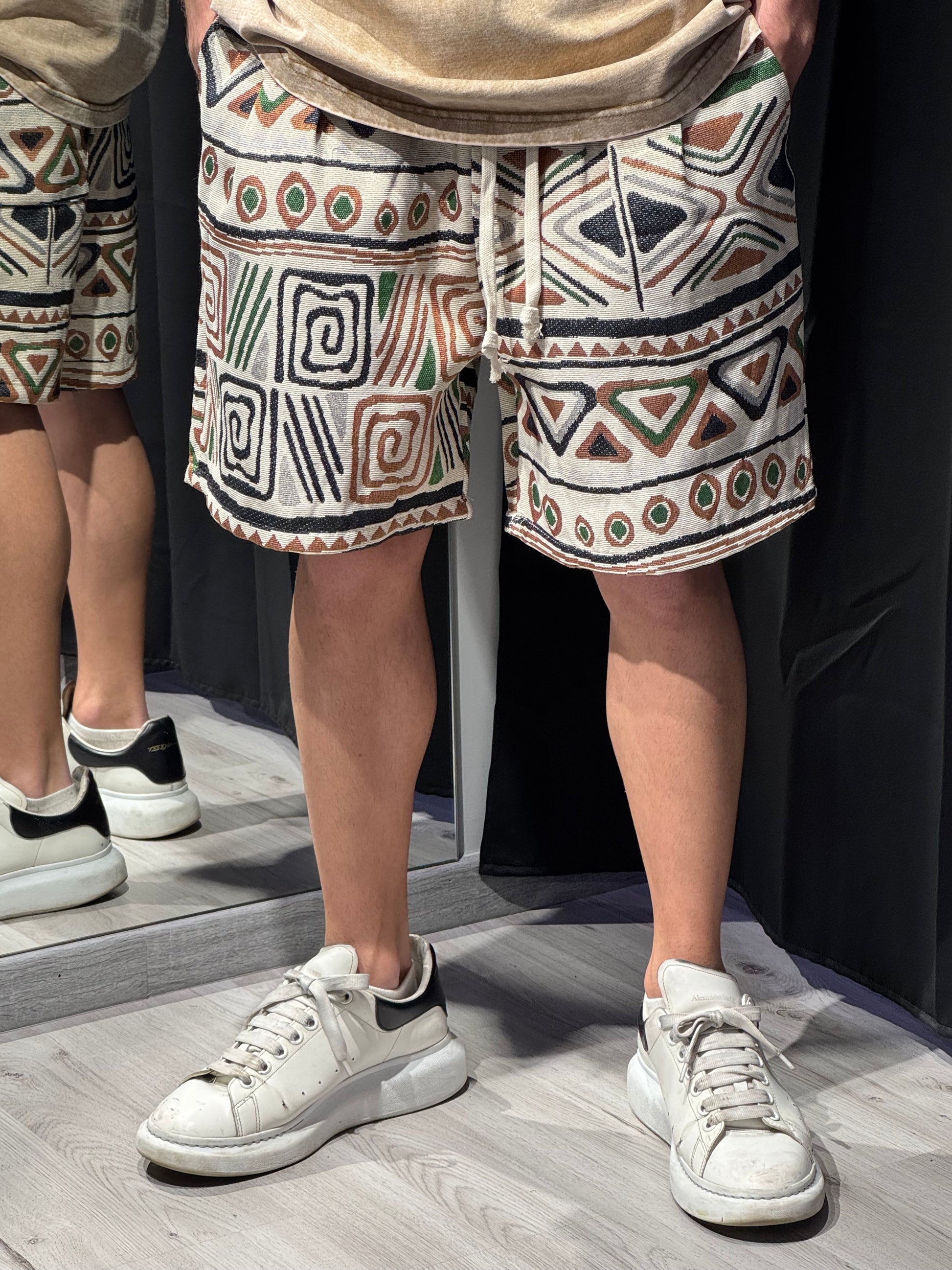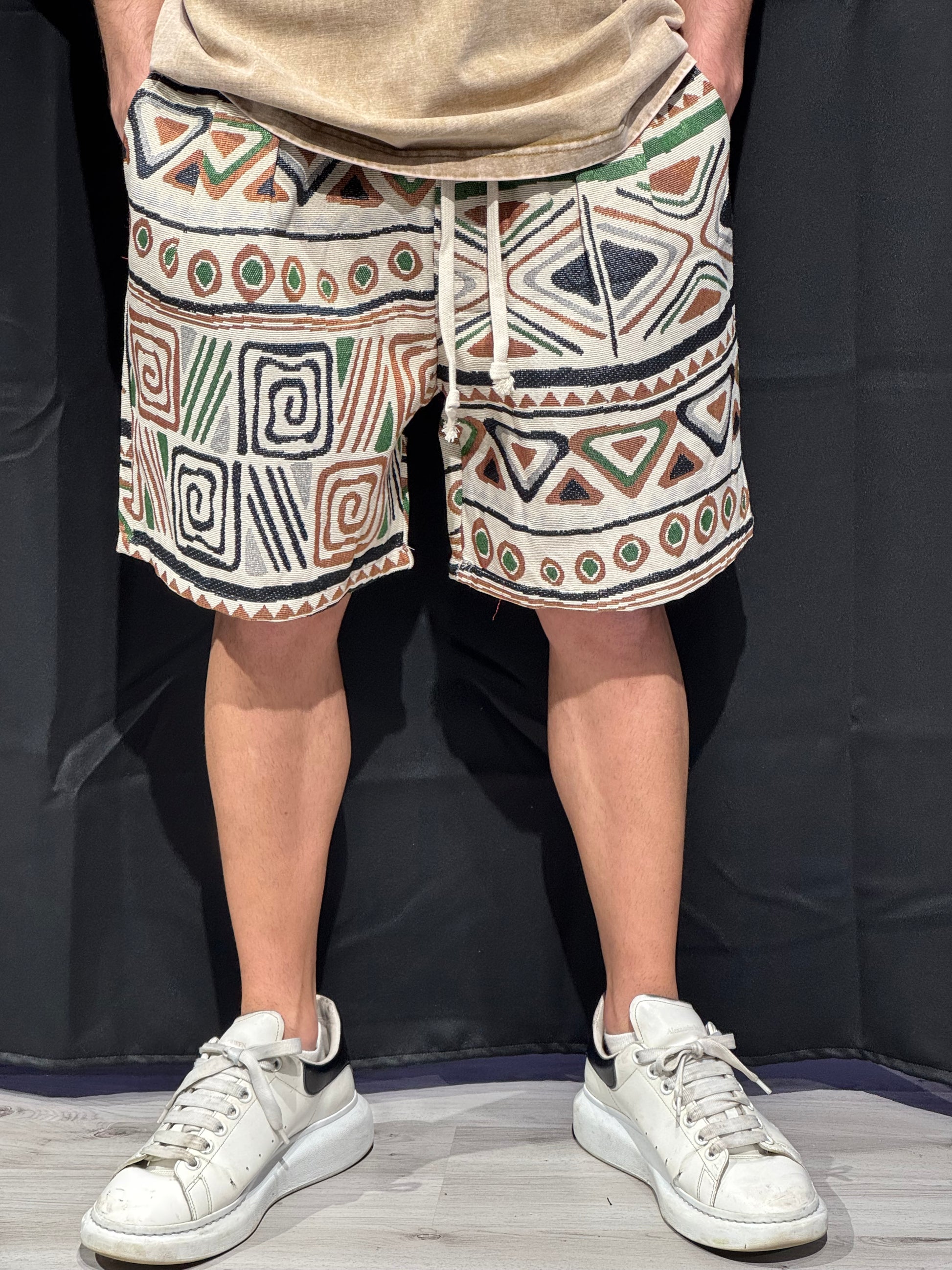 Bermuda con tasche frontali e stampa a forme geometriche che aggiungono dinamismo al capo.