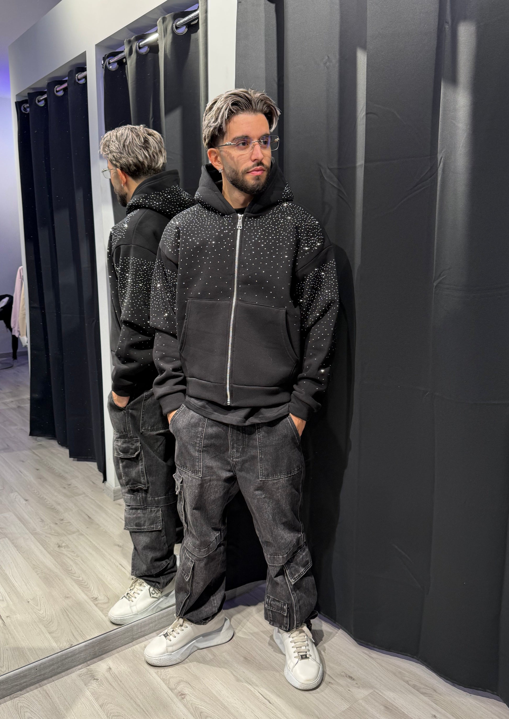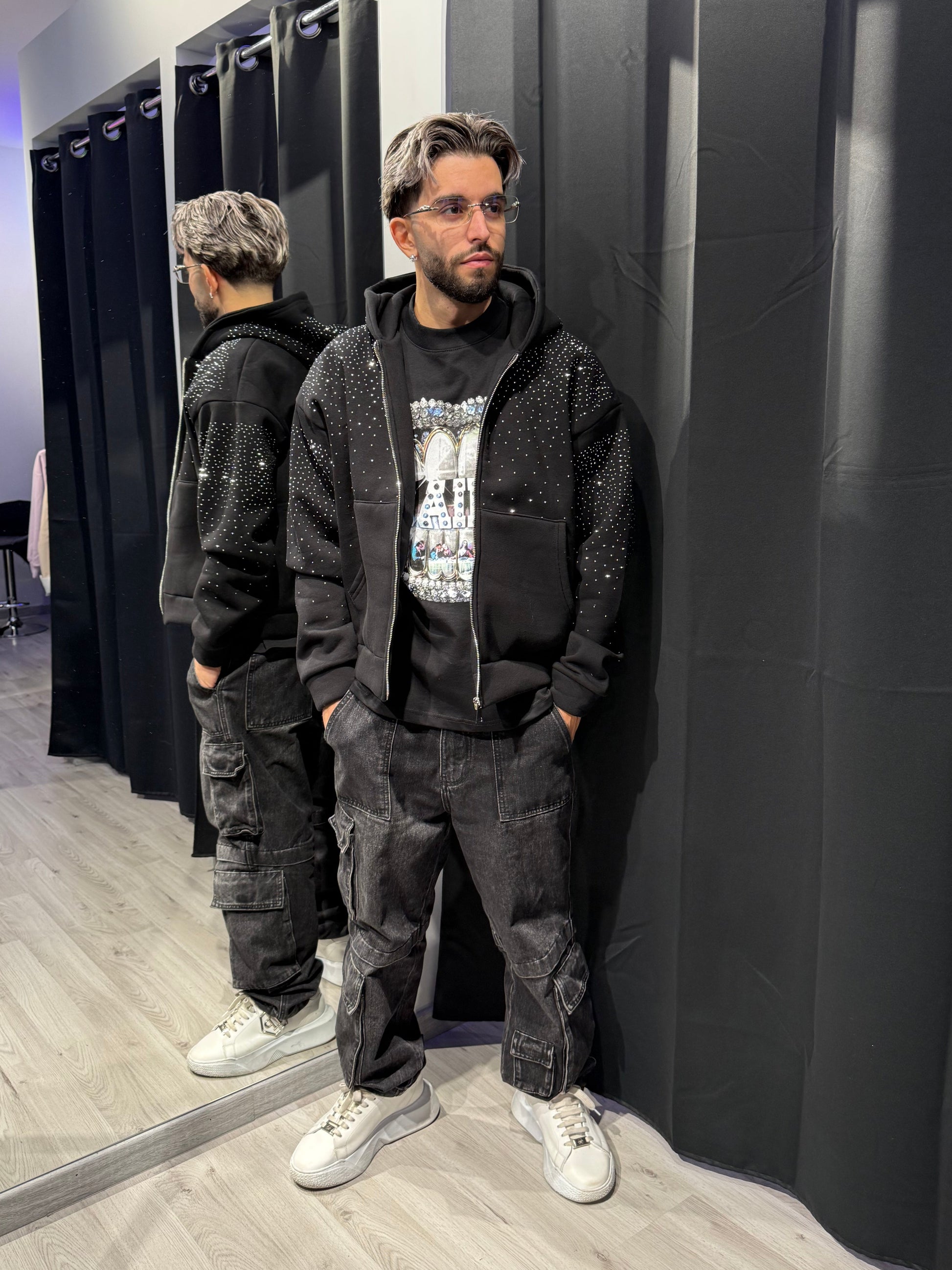 Realizzata in cotone morbido premium, presenta una base nera intensa arricchita da riflessi brillantinati che catturano la luce ad ogni movimento. Perfetta per chi vuole uno stile minimal ma d’impatto, è ideale sia per outfit streetwear eleganti che per serate più cool.