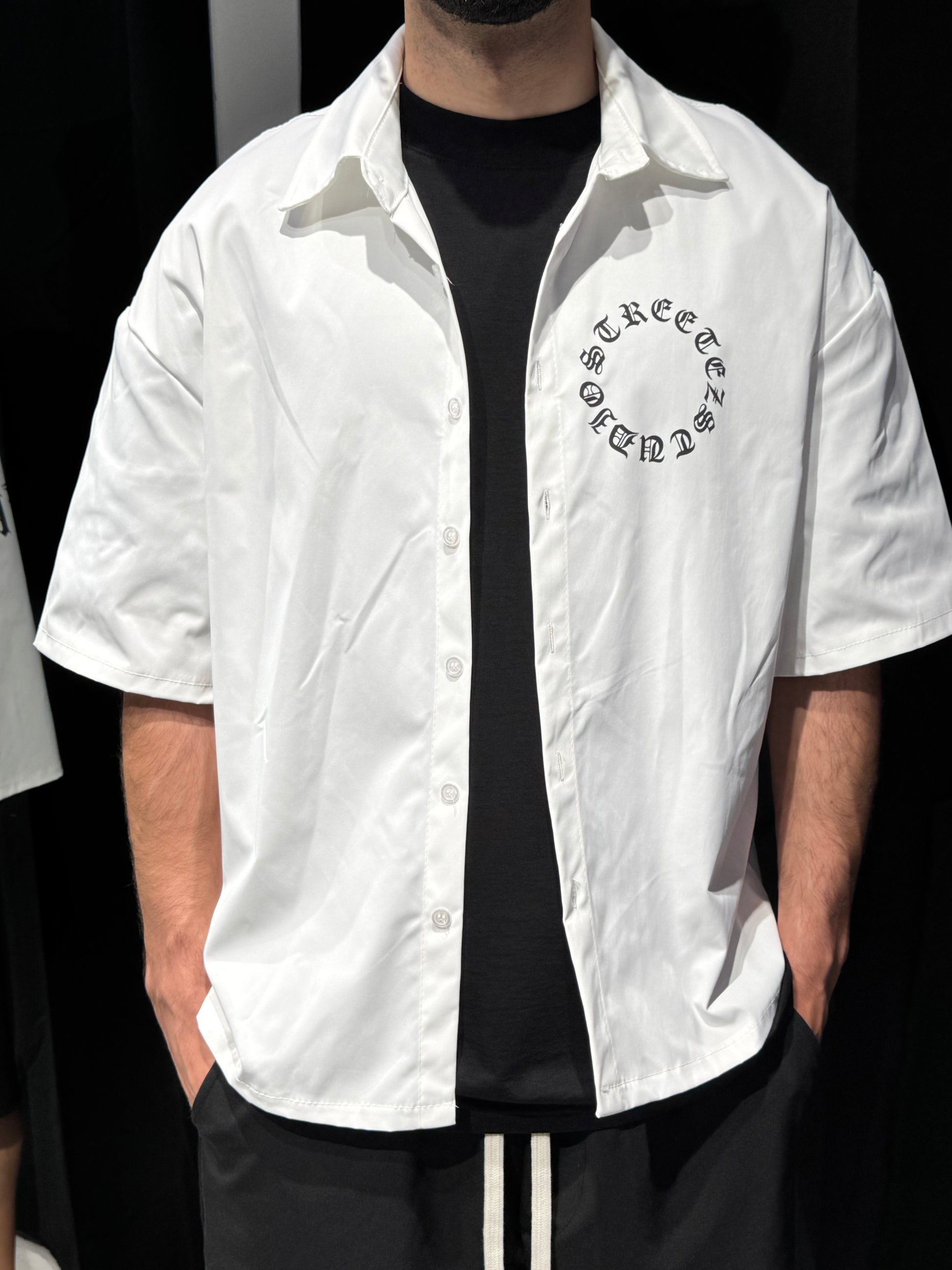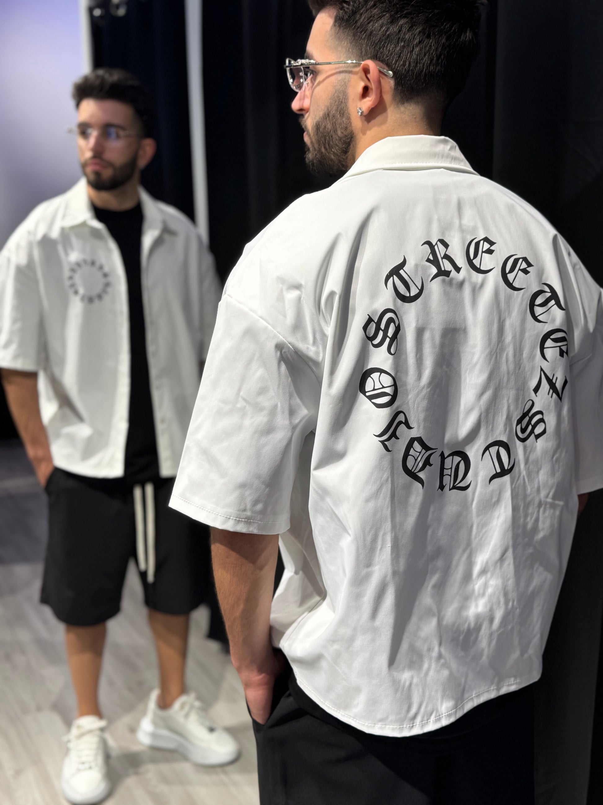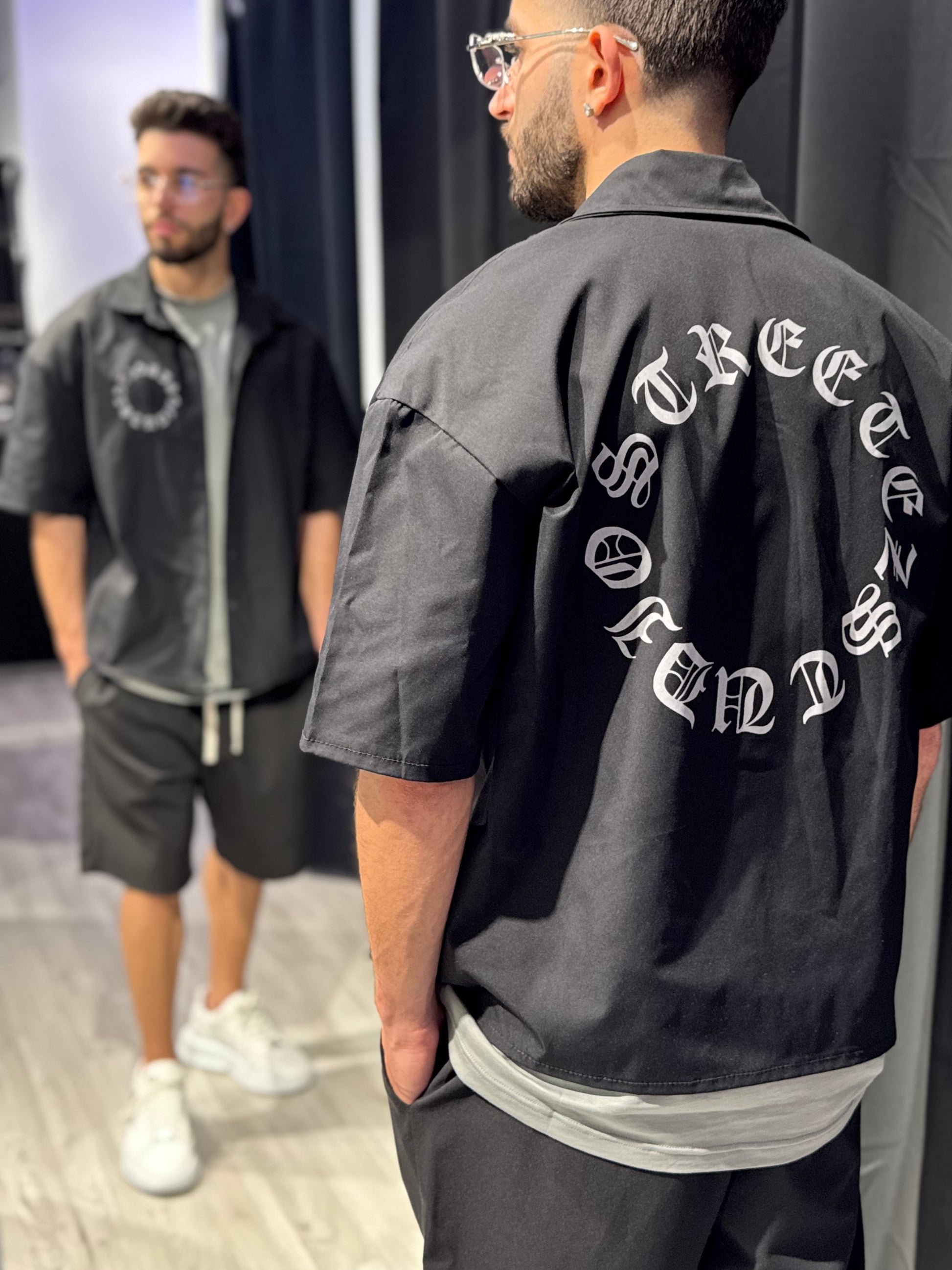 Camicia in stile giapponese con logo circolare minimal sul petto e grafica ingrandita sul retro.