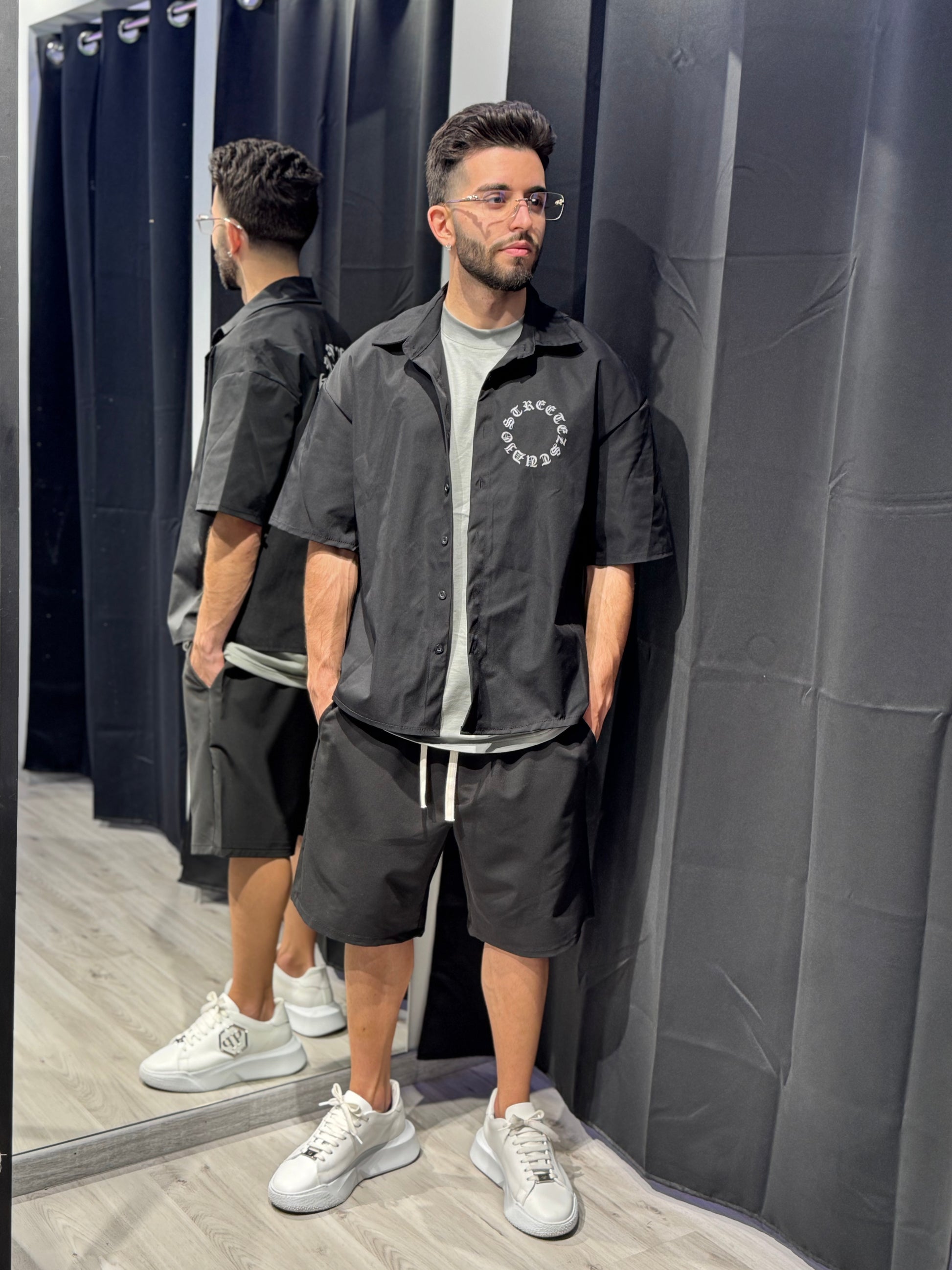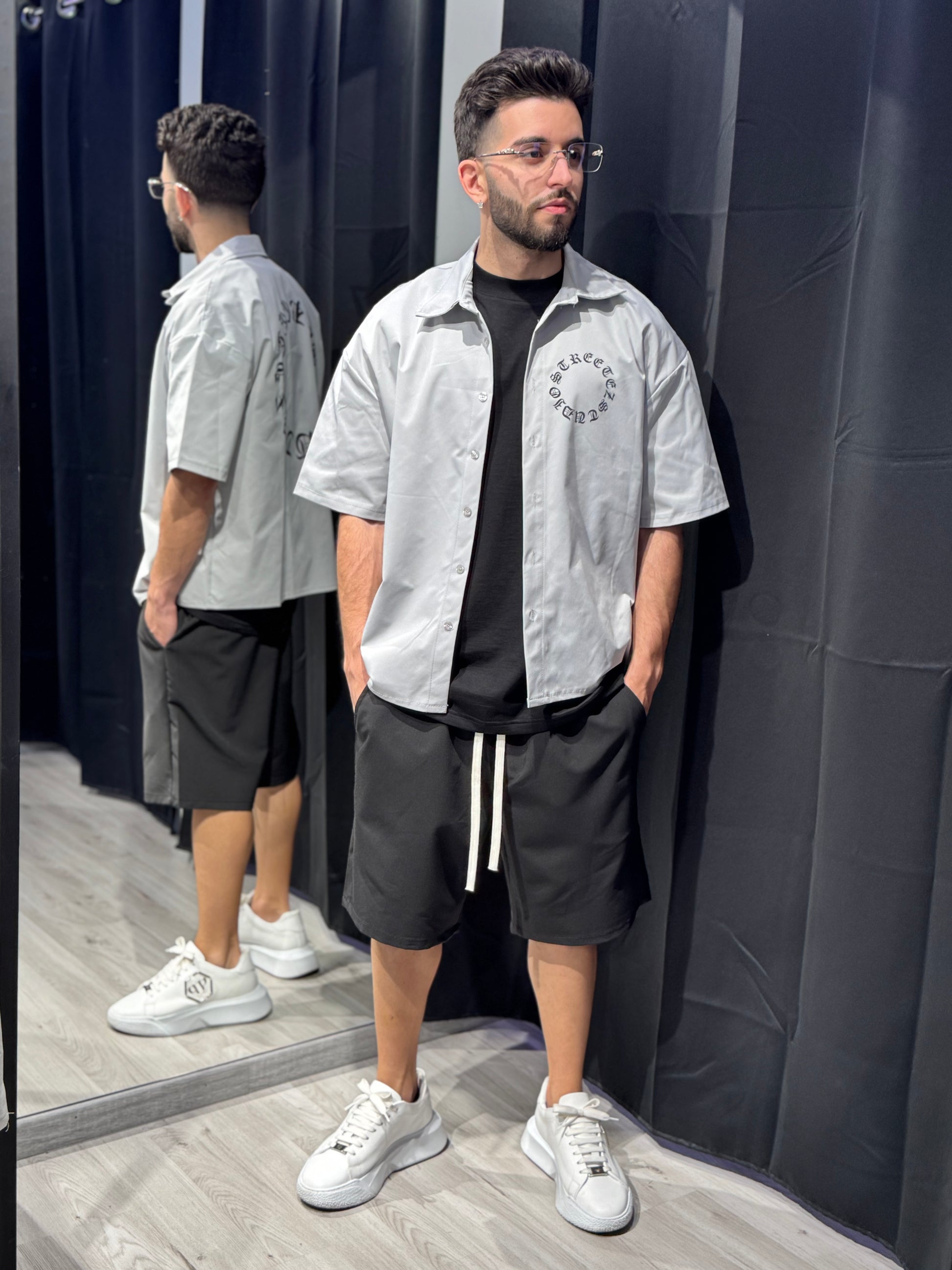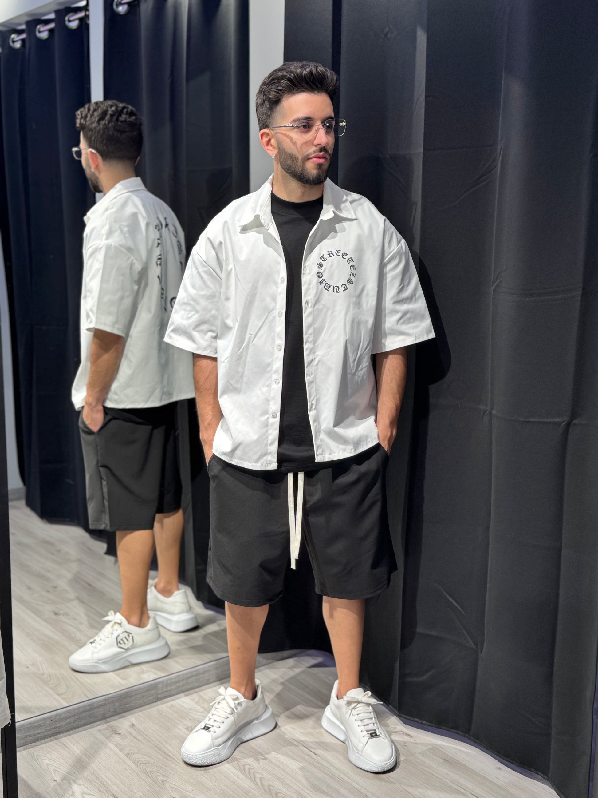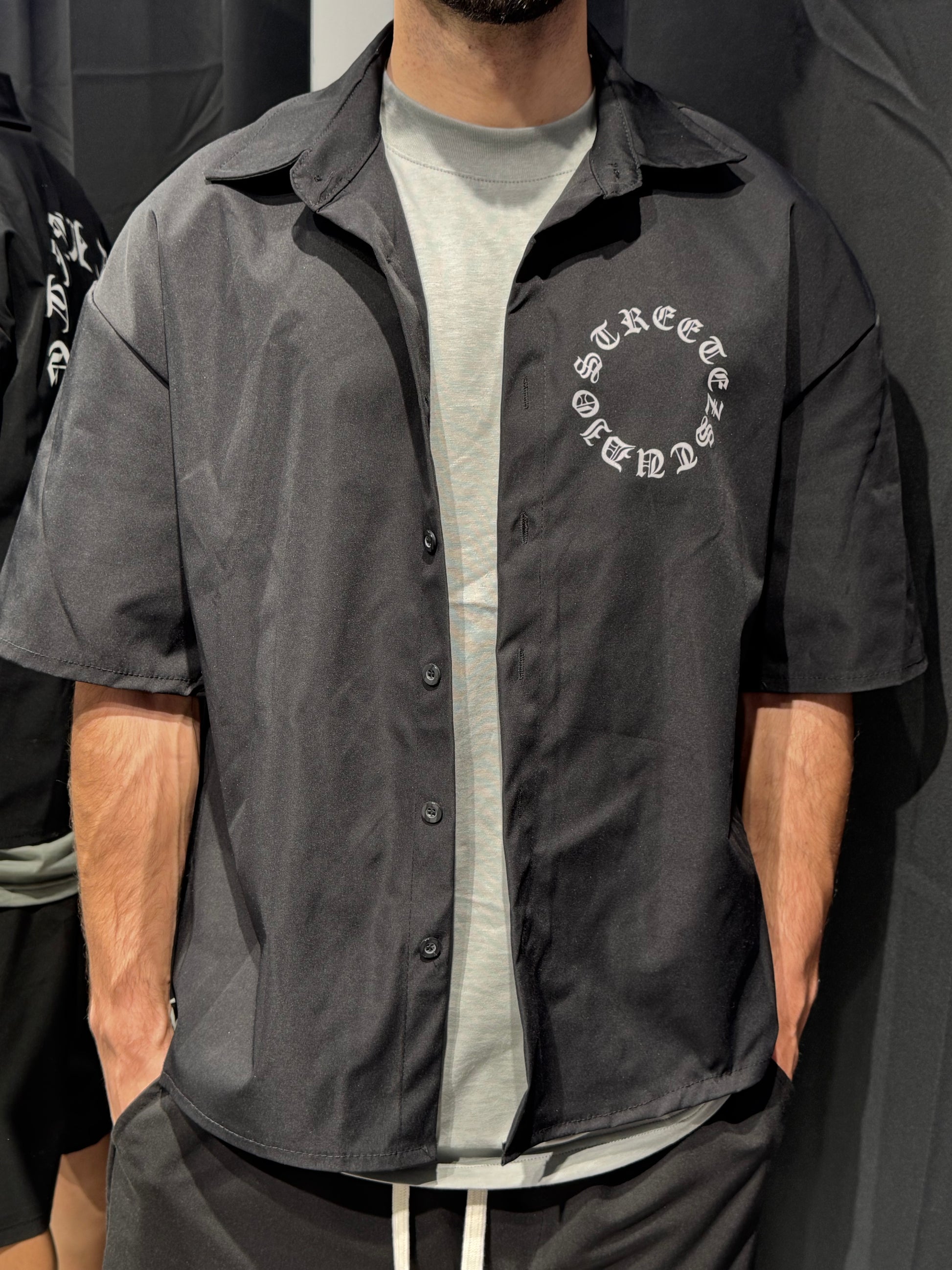 Camicia in stile giapponese con logo circolare minimal sul petto e grafica ingrandita sul retro.