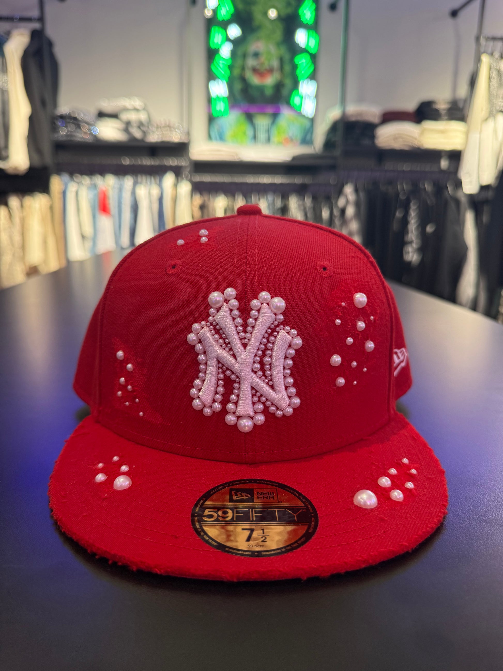 Cappello rosso personalizzato a mano con applicazioni di perle sfumate distribuite in modo artistico, anche intorno al logo frontale. Ogni dettaglio è curato per creare un effetto elegante ma d’impatto, trasformando il cappello in un pezzo unico e ricercato. Un accessorio perfetto per chi vuole uno stile esclusivo, creativo e impossibile da ignorare.