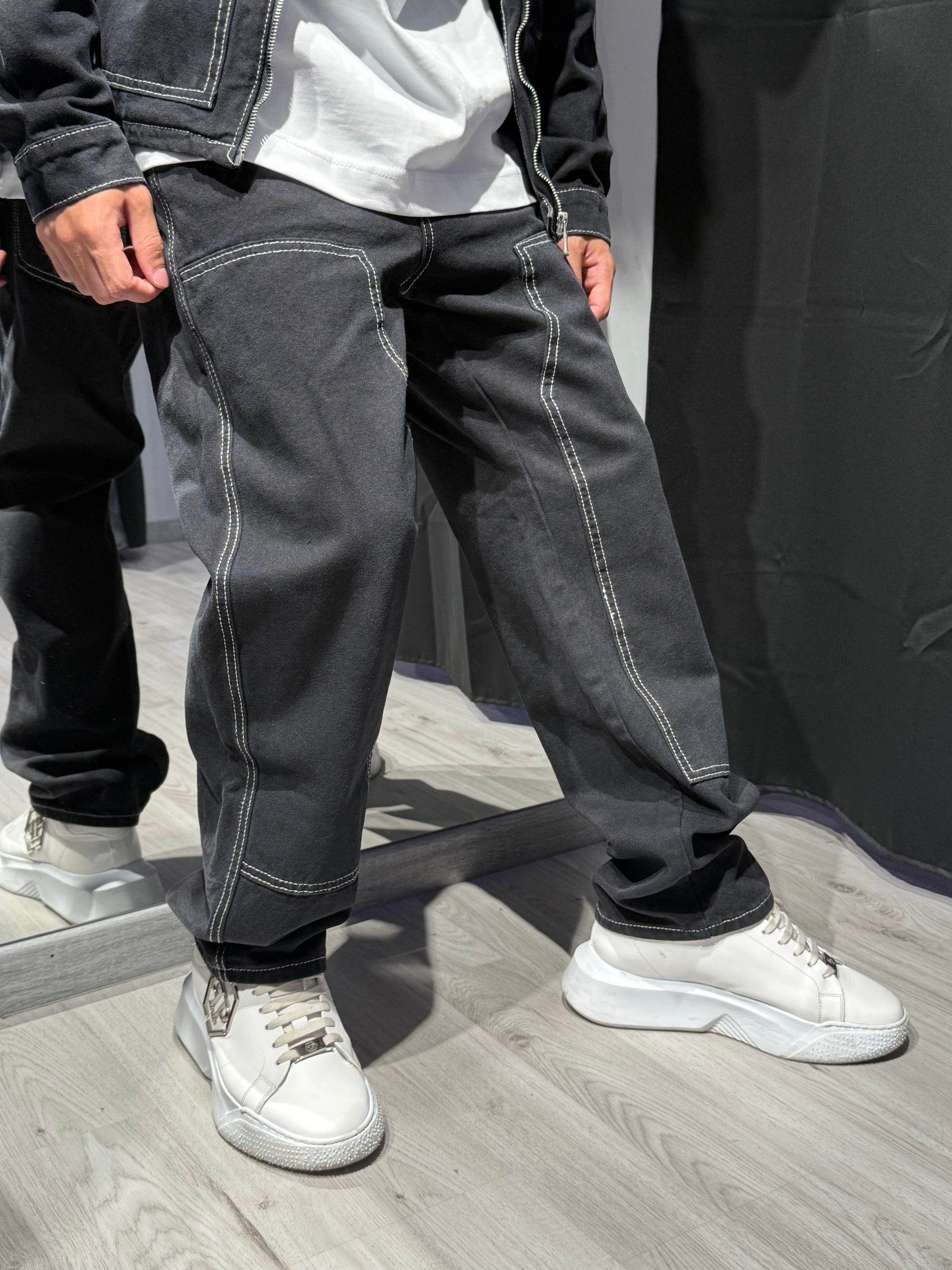 Giacca e jeans in denim con cuciture bianche a contrasto. Design urban e finiture ricercate per un look contemporaneo e di carattere