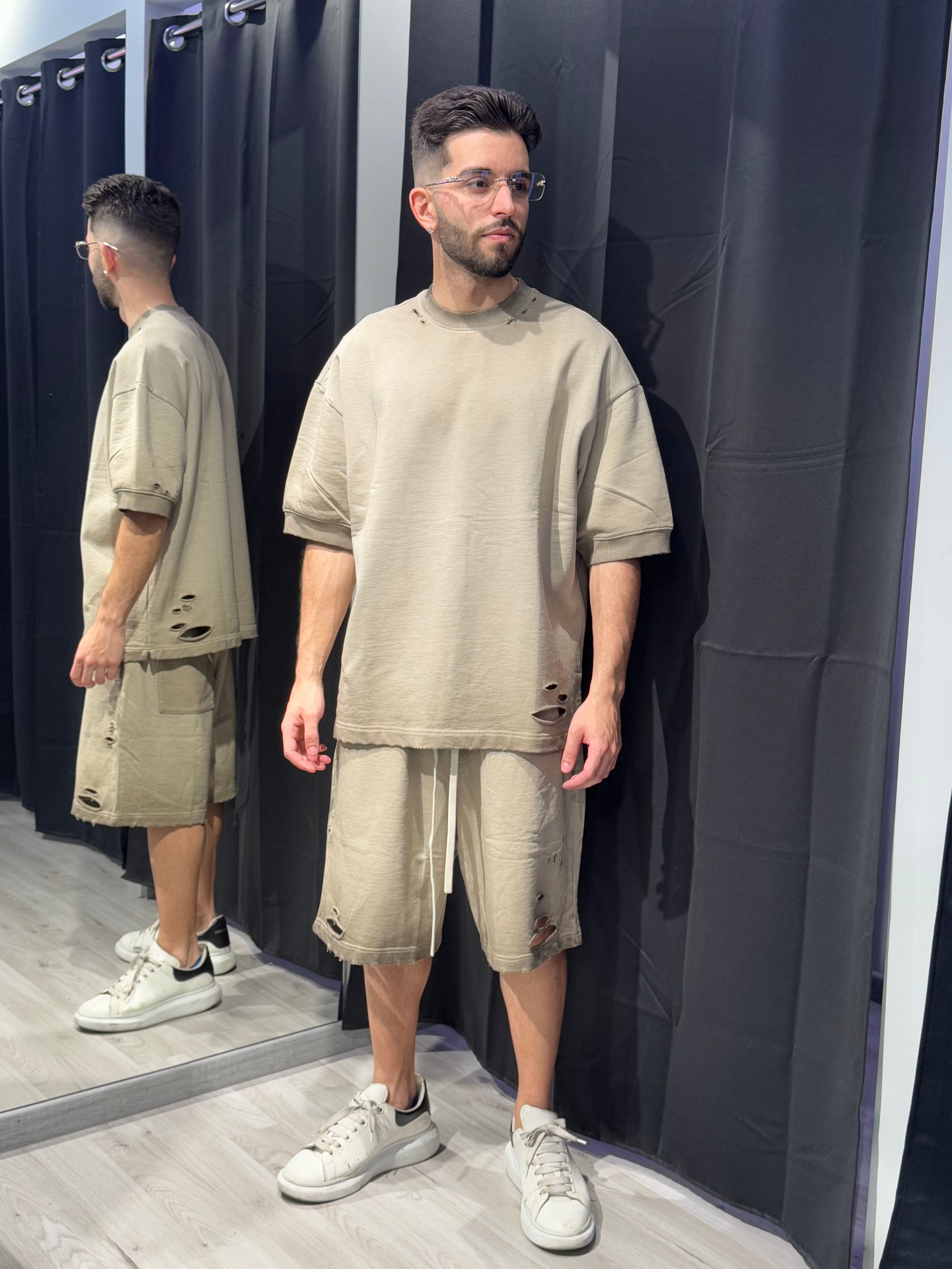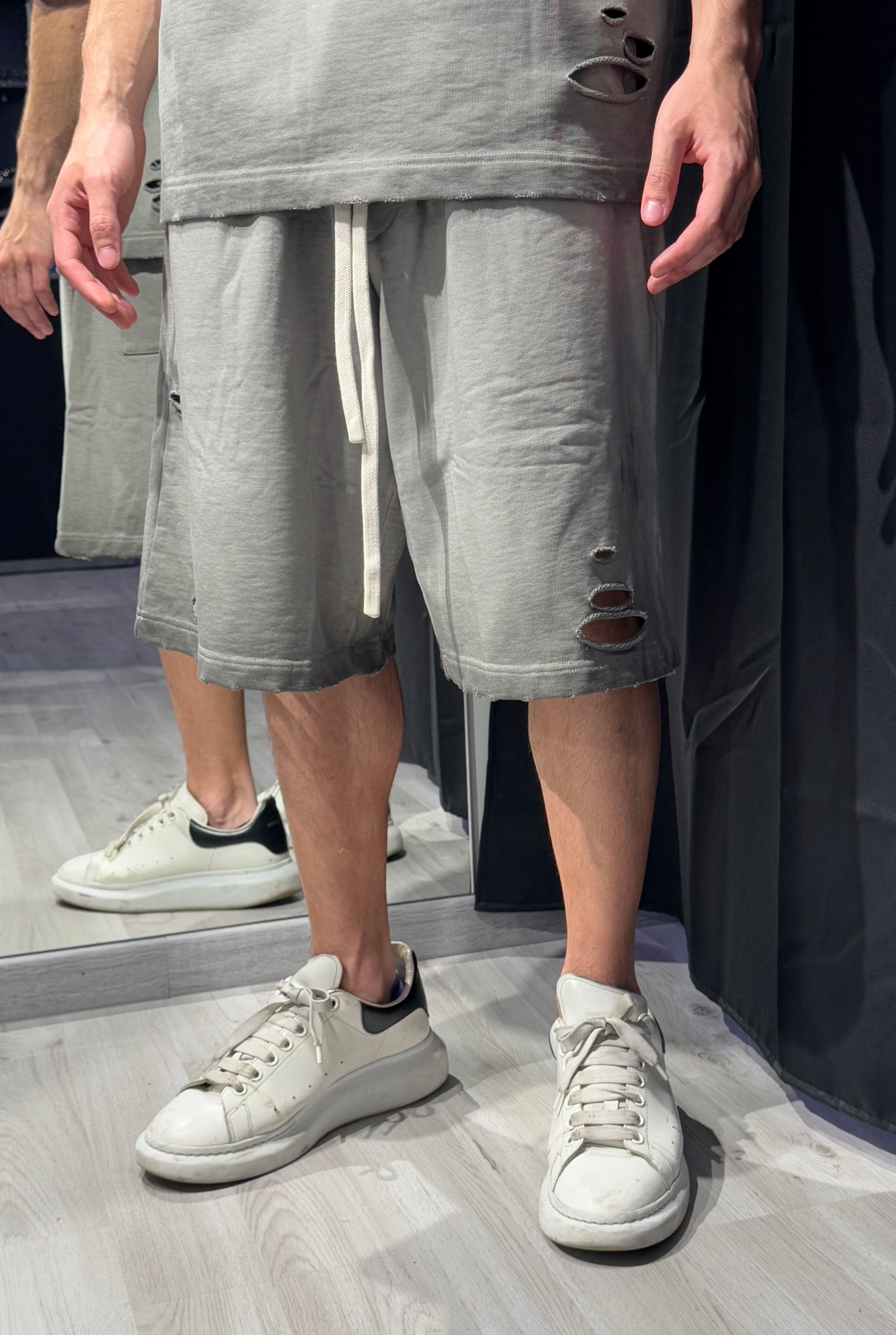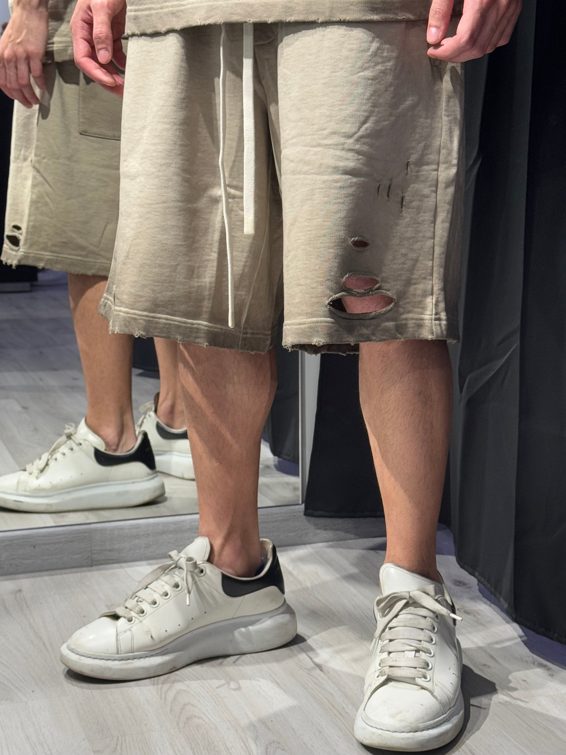Tessuto spesso, lavaggio stonewashed e bordi grezzi con lacerazioni leggere. Coordinato perfetto da abbinare ad accessori streetwear.
