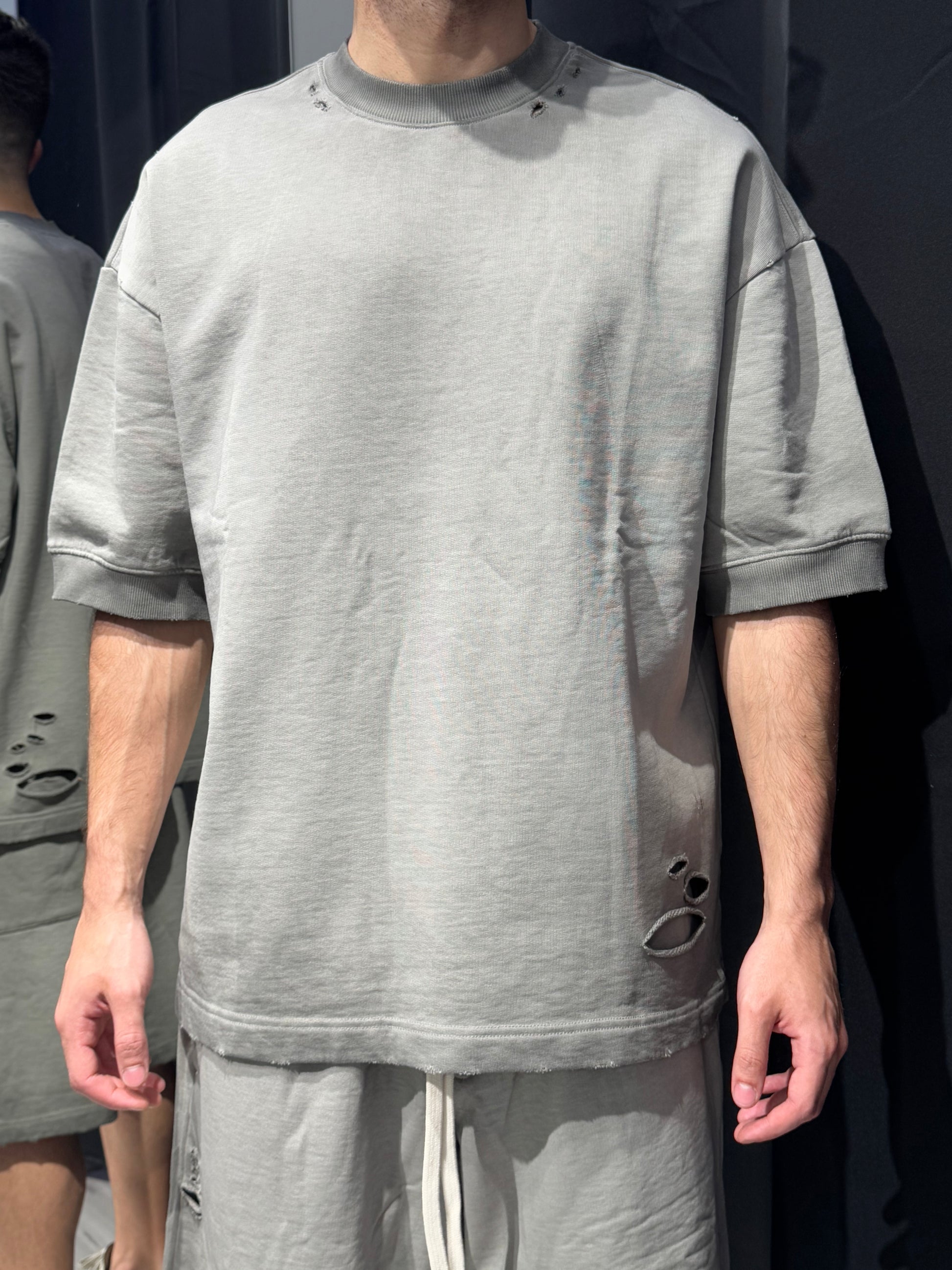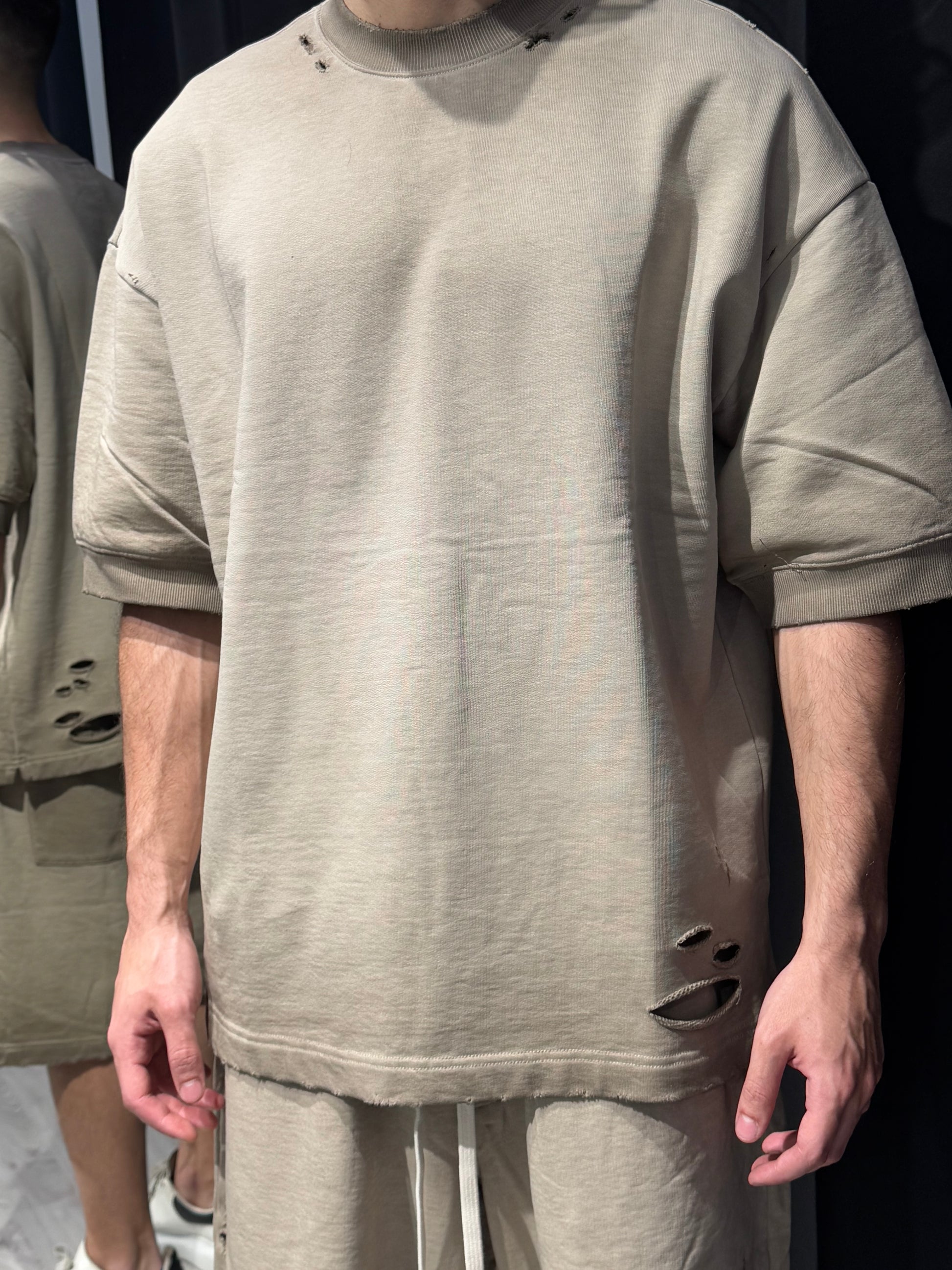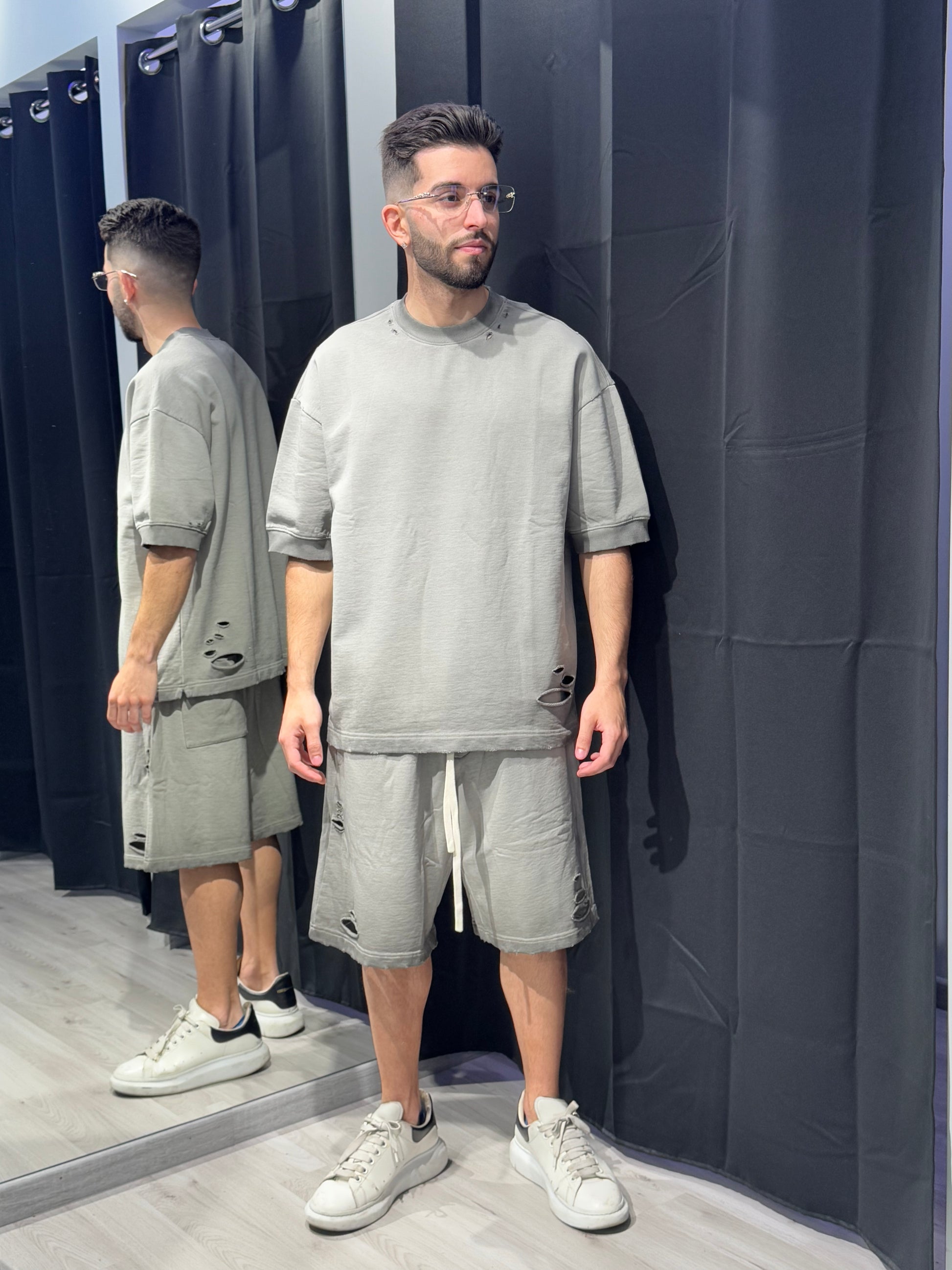 Tessuto spesso, lavaggio stonewashed e bordi grezzi con lacerazioni leggere. Coordinato perfetto da abbinare ad accessori streetwear.