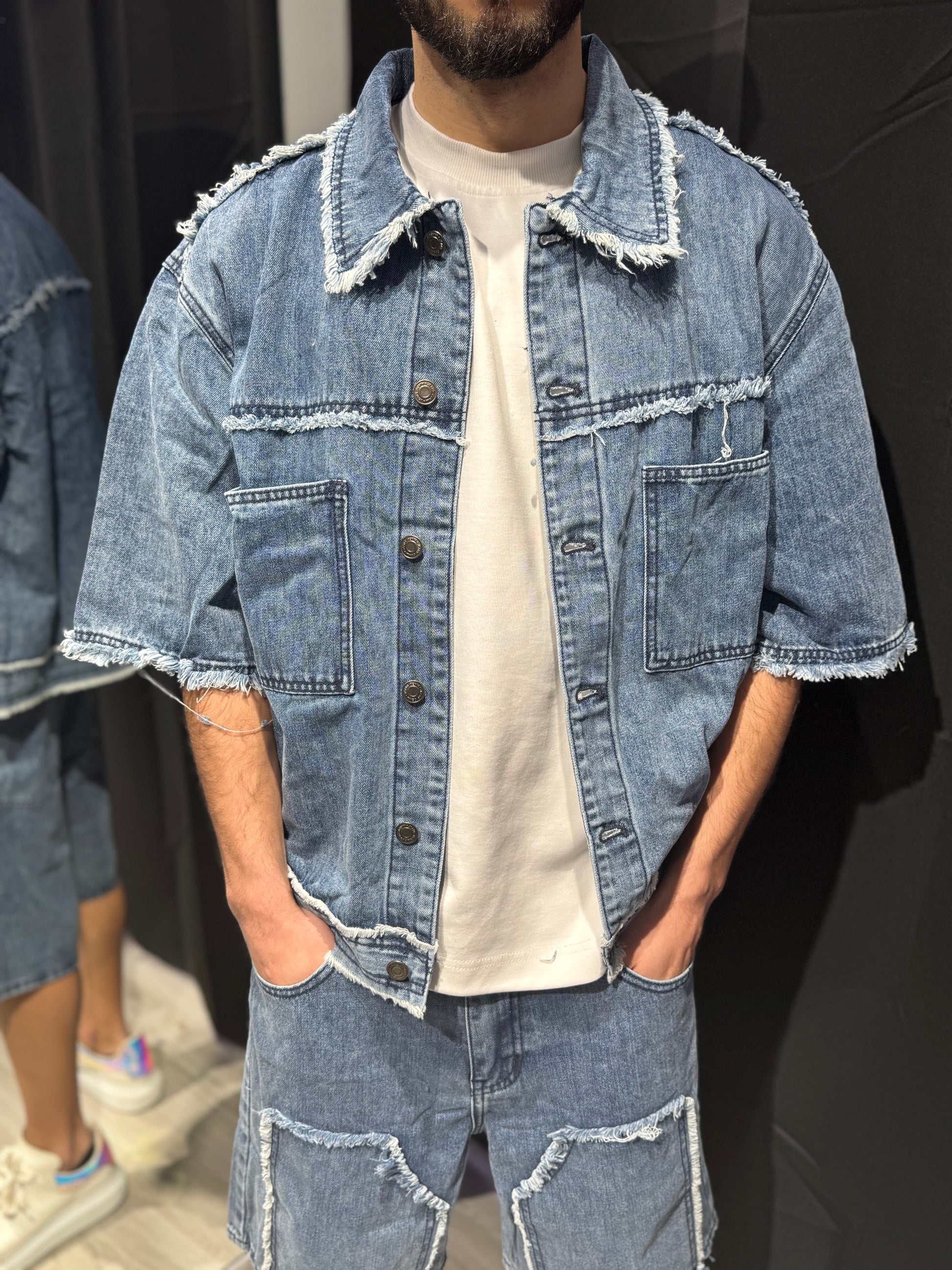 Coordinato in jeans e dettagli sdruciti.