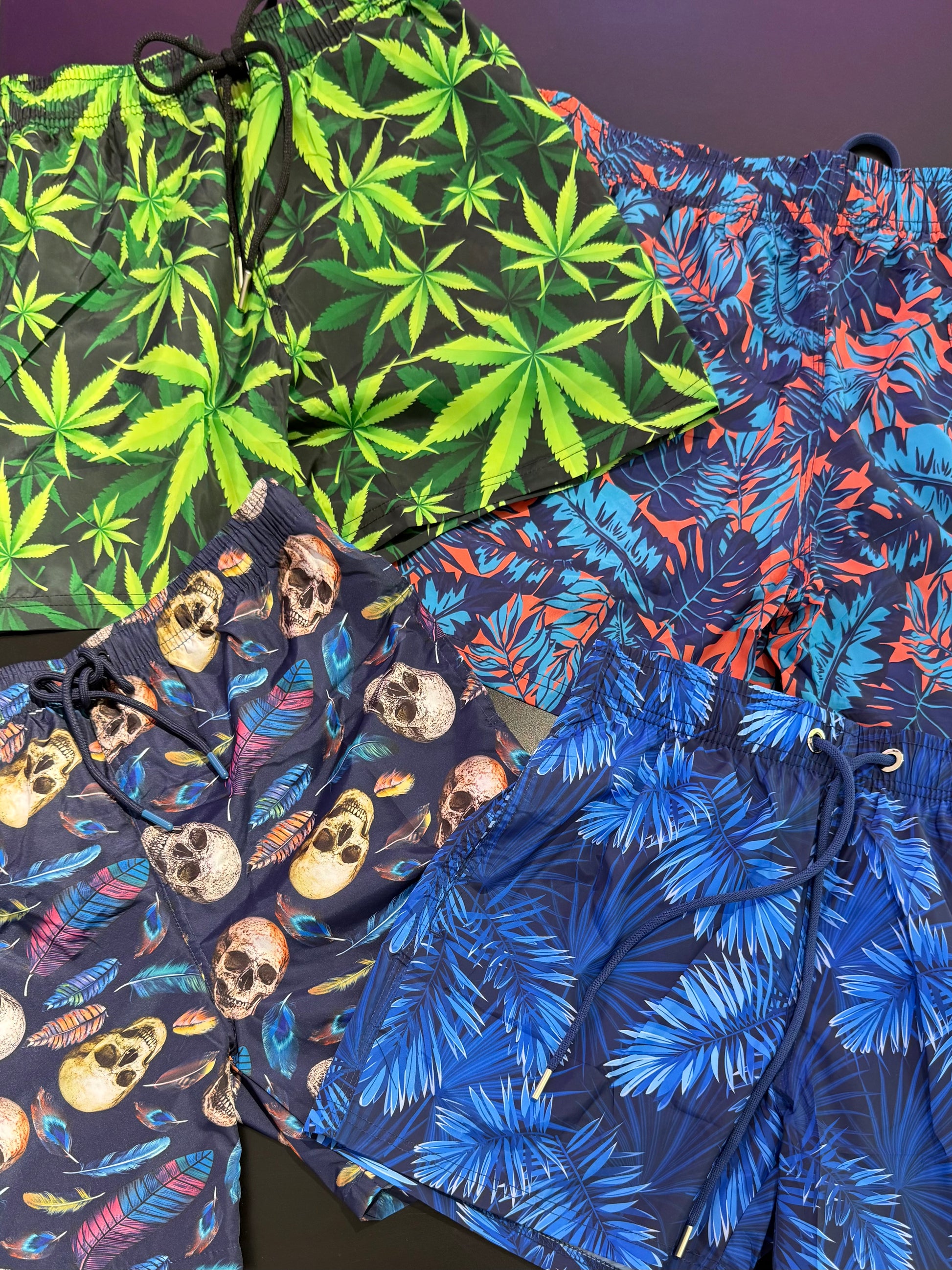 Stampa all-over che mescola foglie tropicali e teschi in contrasto: un mix audace tra natura selvaggia e dark vibes.