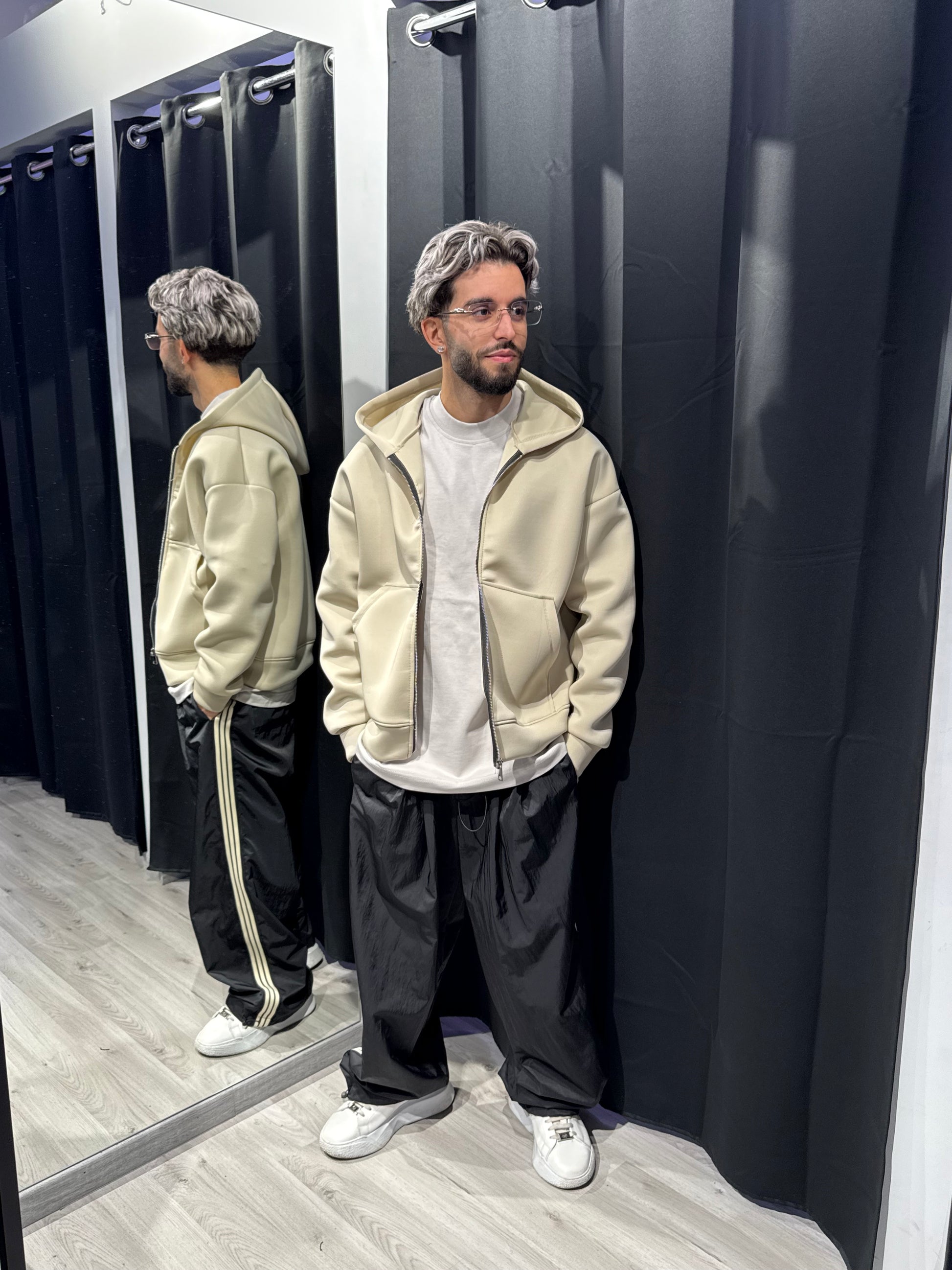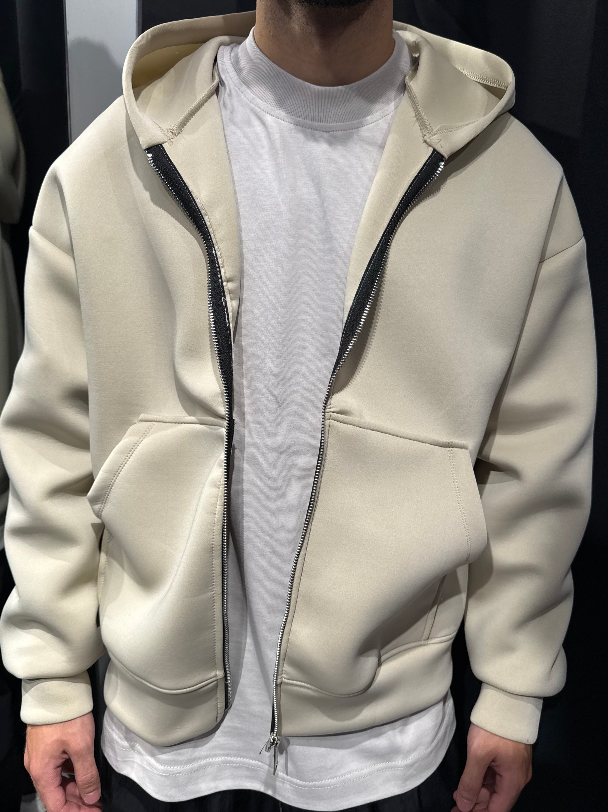 Una felpa dal design unico, realizzata in tessuto scuba strutturato che mantiene sempre la sua forma. Il materiale rigido dona un look moderno e pulito, ideale per outfit streetwear distintivi. Dotata di zip frontale e dettagli minimal, è perfetta per chi cerca stile e carattere in ogni situazione.