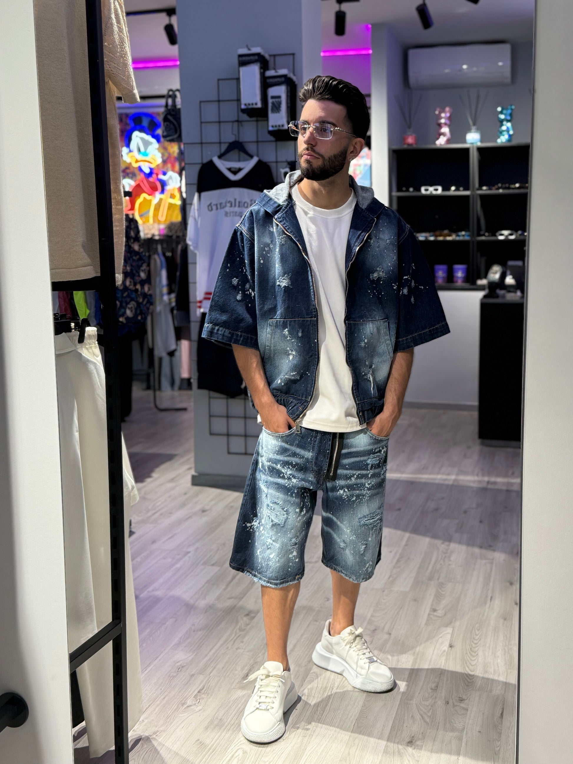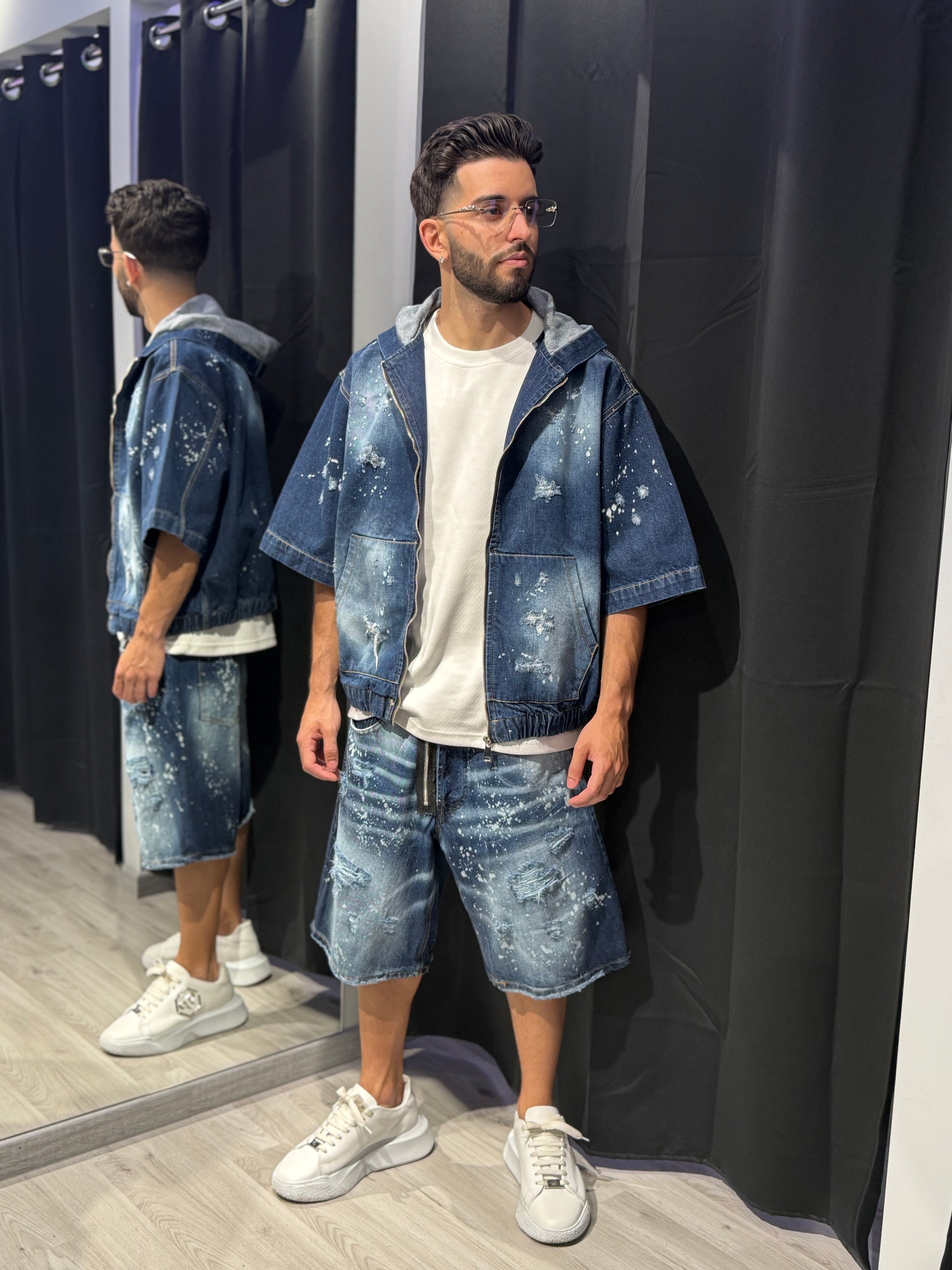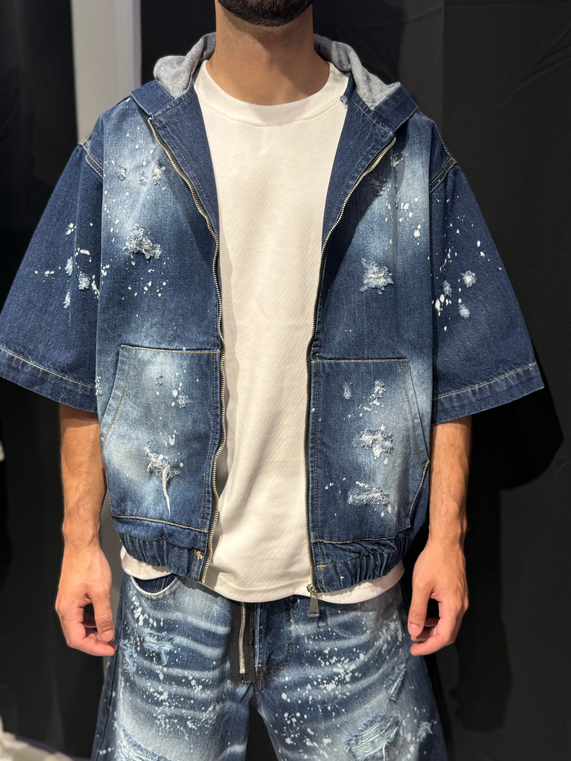 Questo completo giacca + jeans riprende lo stile iconico Dsquared2 con schizzi di vernice a contrasto su base denim effetto slavato.