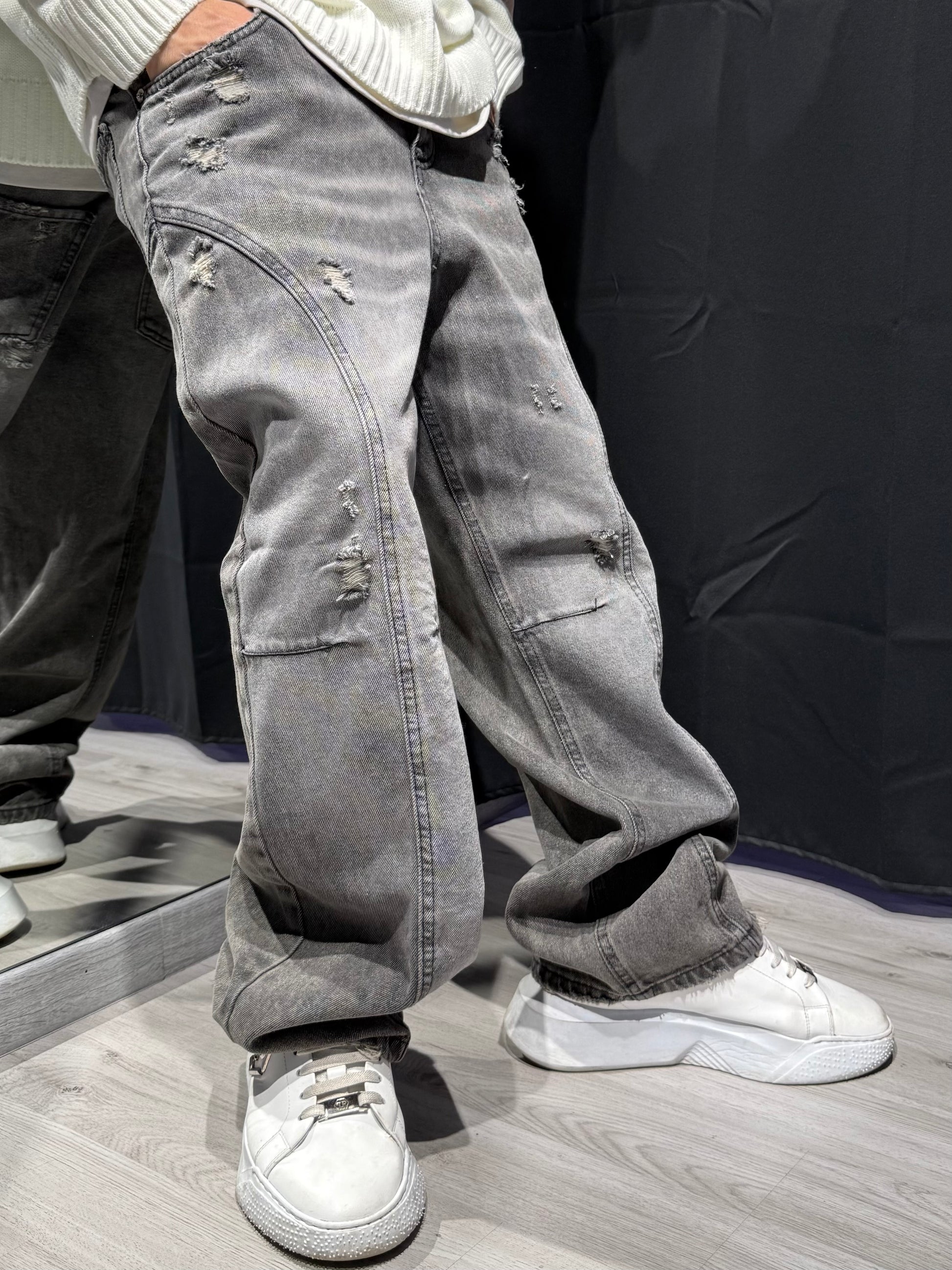 Jeans baggy fit in tonalità grigio washed, con dettagli leggermente sfrangiati che aggiungono carattere e un tocco vissuto.