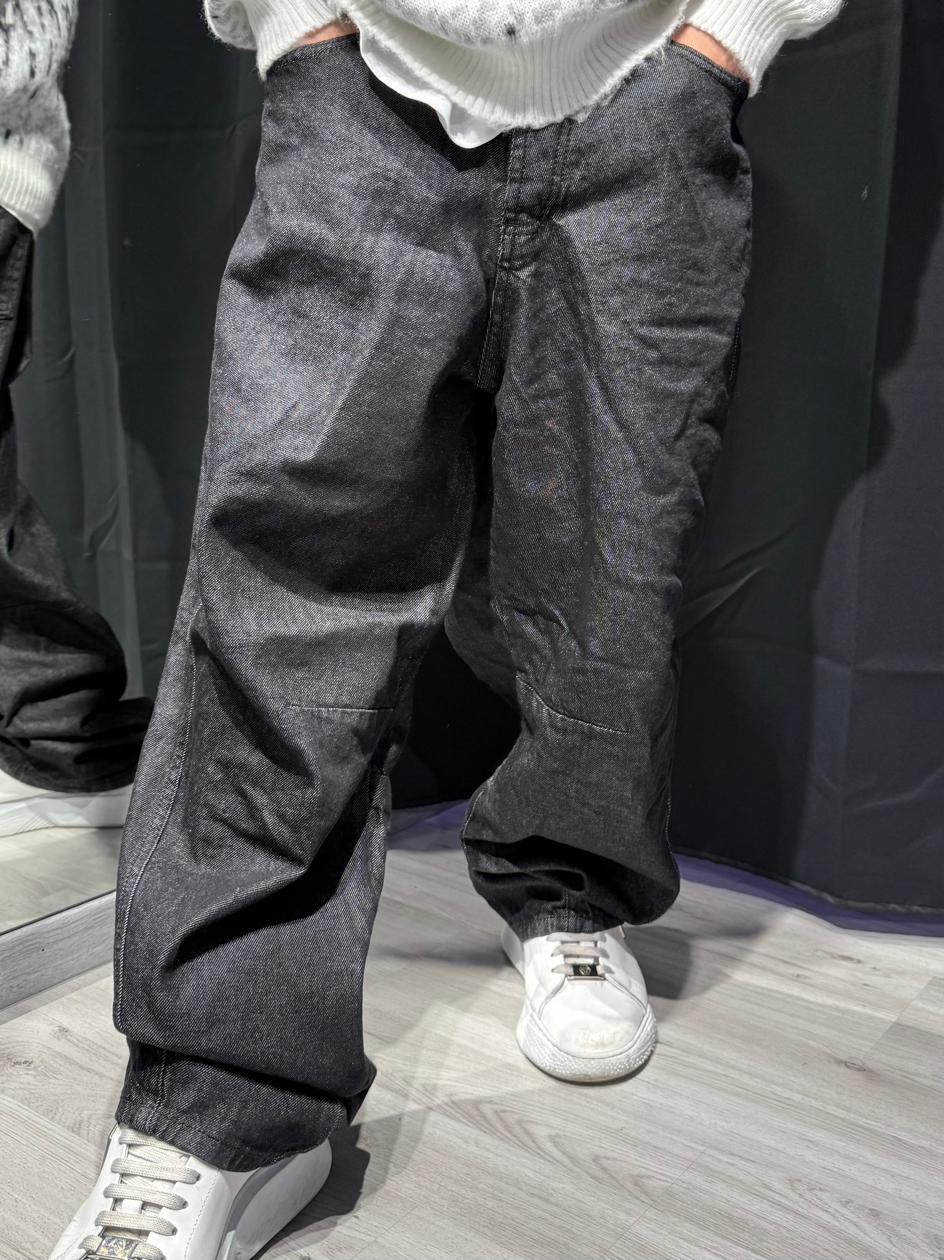 Un must-have del guardaroba streetwear. Questo jeans baggy nero presenta una vestibilità ampia e rilassata, perfetta per un look moderno senza troppi fronzoli. Realizzato in denim resistente, mantiene la forma senza perdere comfort. Il colore nero pieno lo rende facilissimo da abbinare a qualsiasi outfit