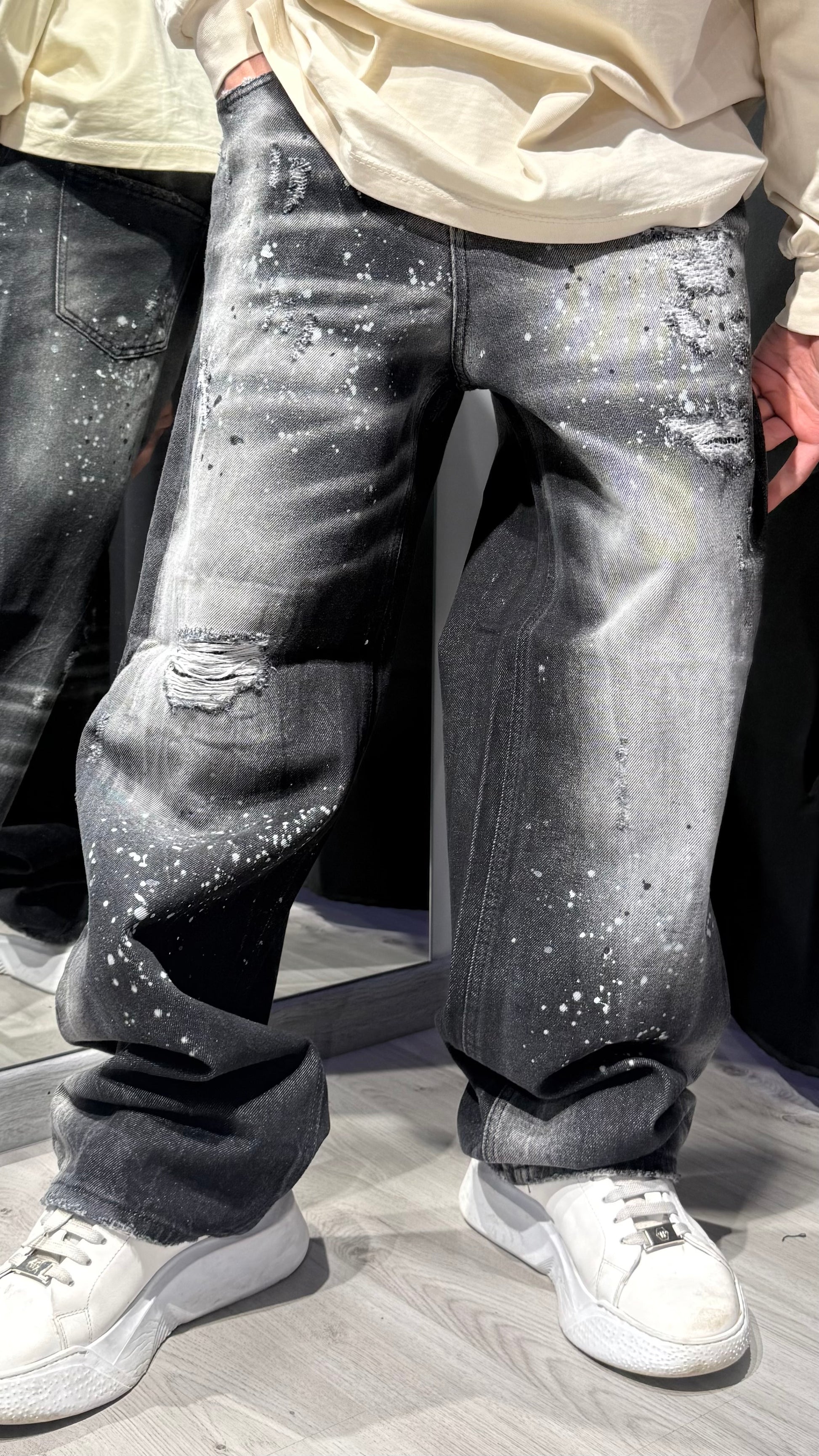 Jeans baggy modello DSQ con schizzi e sfumature dal look artistico e grintoso. Il lavaggio lavorato con effetti scoloriti e dettagli paint dona personalità al capo, rendendolo unico e fuori dal comune. Vestibilità ampia e comoda, perfetta per chi vuole distinguersi senza rinunciare allo stile.