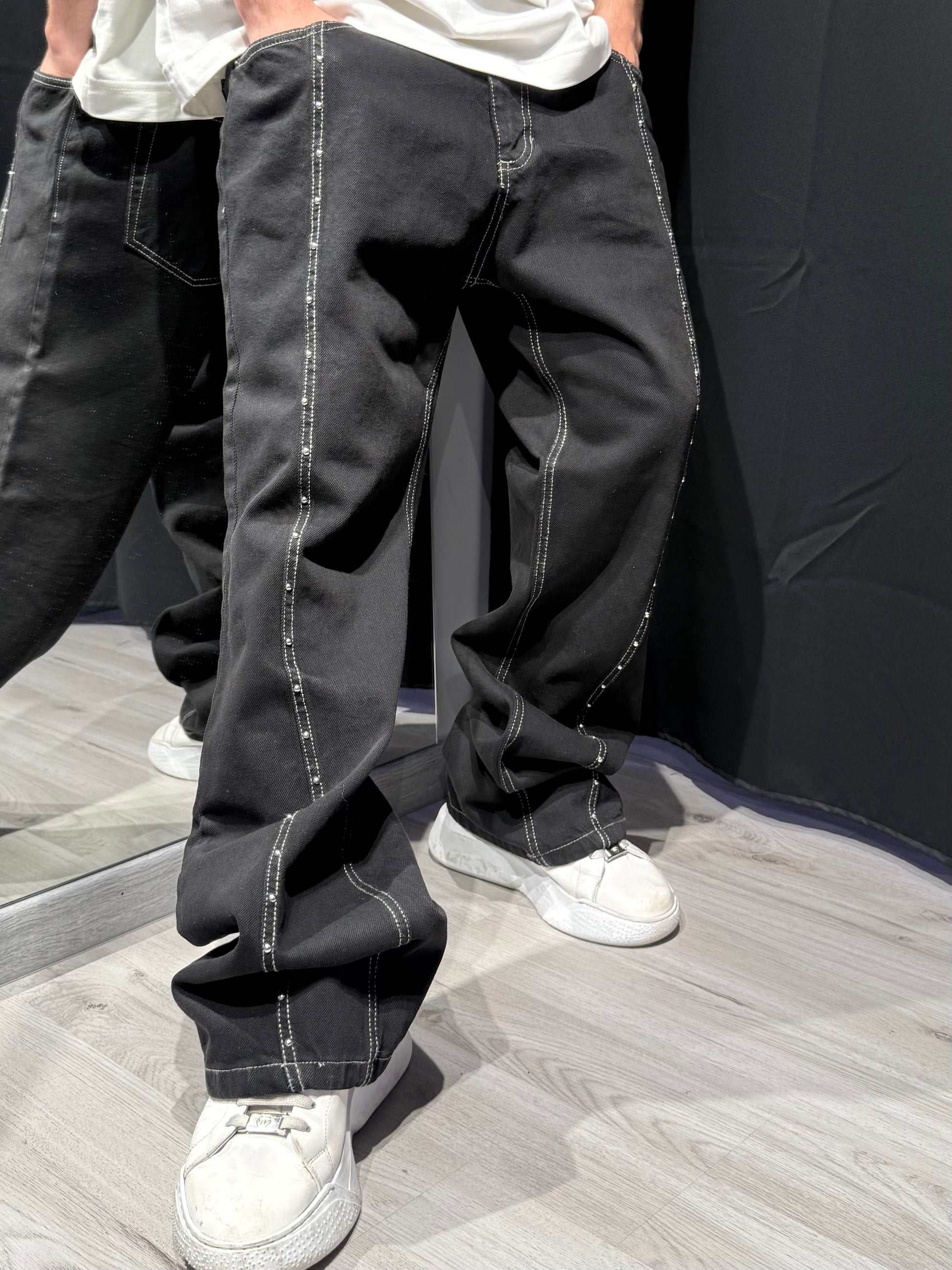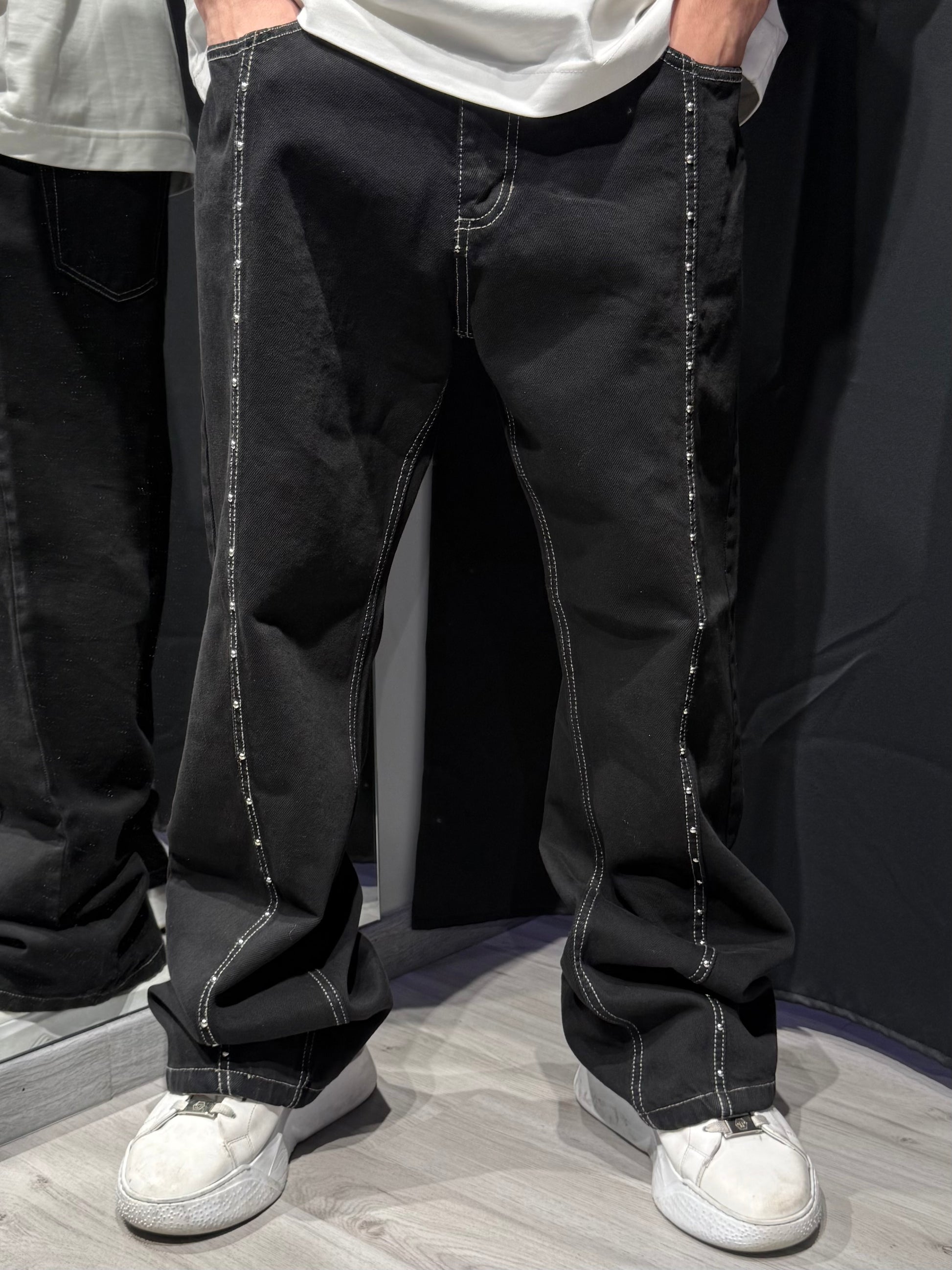 Vestibilità baggy ampia e comoda, perfetta per uno stile street deciso. Il dettaglio che cambia tutto? Le borchie applicate lungo la linea centrale, che creano un effetto forte, verticale e super impattante.