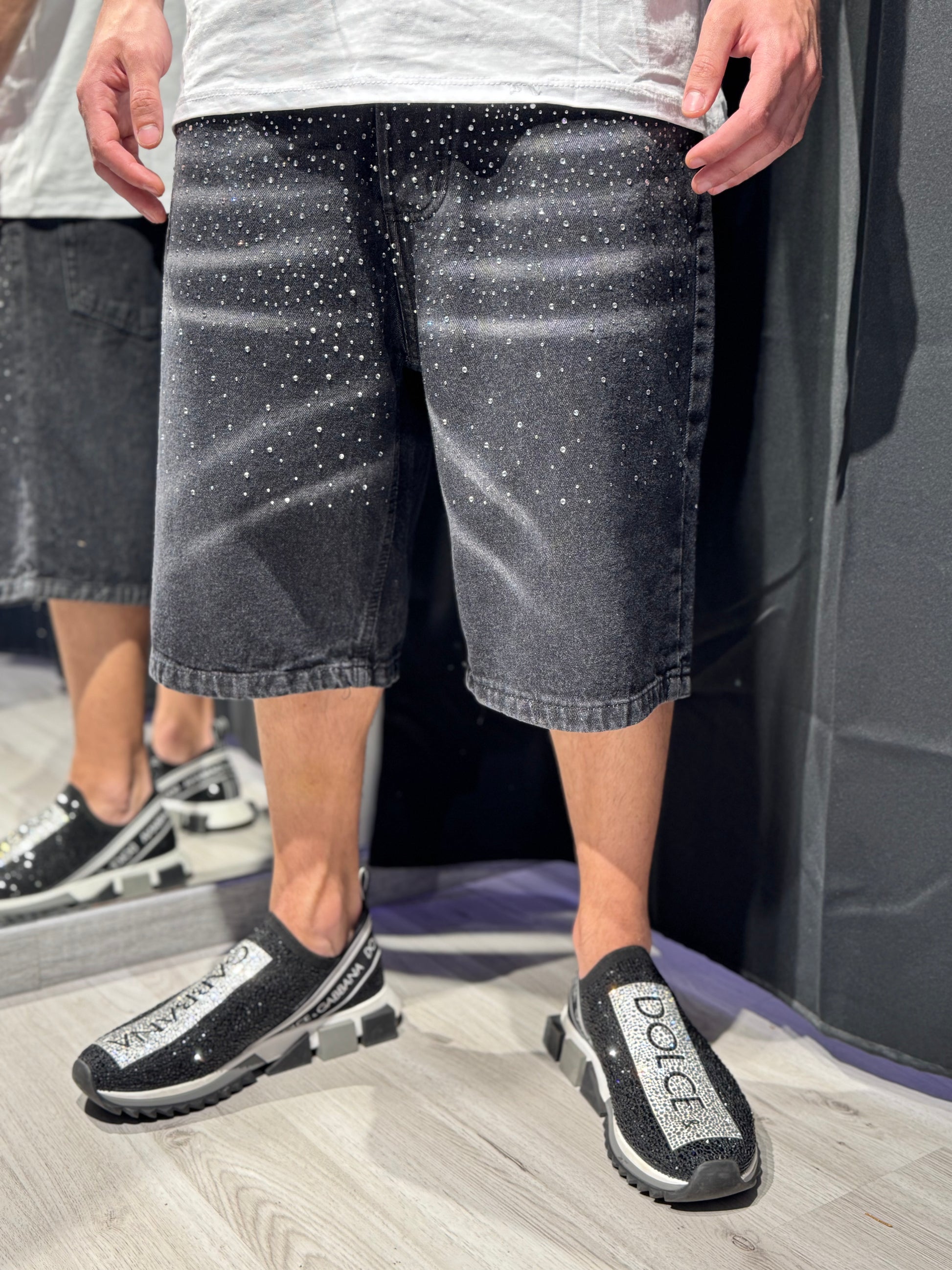 Un denim che non passa inosservato: taglio relaxed, lavaggio vintage e dettagli brillantinati applicati a mano per riflettere la tua personalità, non solo la luce.