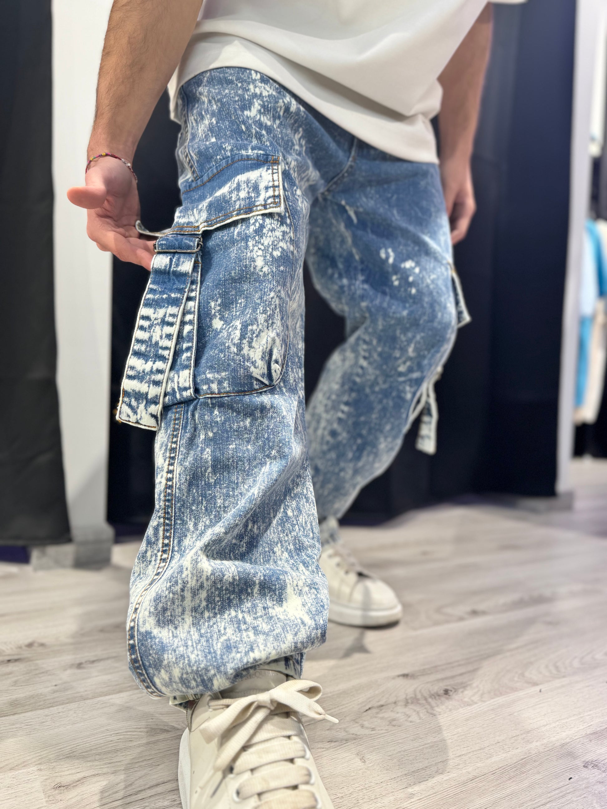 Jeans cargo point con un effetto unico che passa dal denim al bianco, creando un contrasto originale e d’impatto. Dotati di tasconi laterali in pieno stile streetwear, uniscono praticità e carattere per un look urbano distintivo.