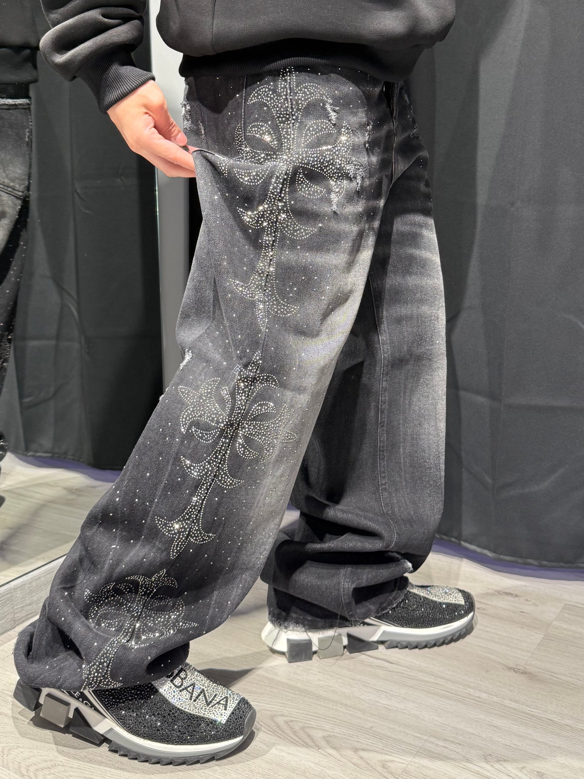 I Crystal Cross Baggy Denim sono pensati per chi vuole brillare senza esagerare. Con una vestibilità baggy dal taglio morbido e moderno, questi jeans uniscono comfort e presenza scenica.