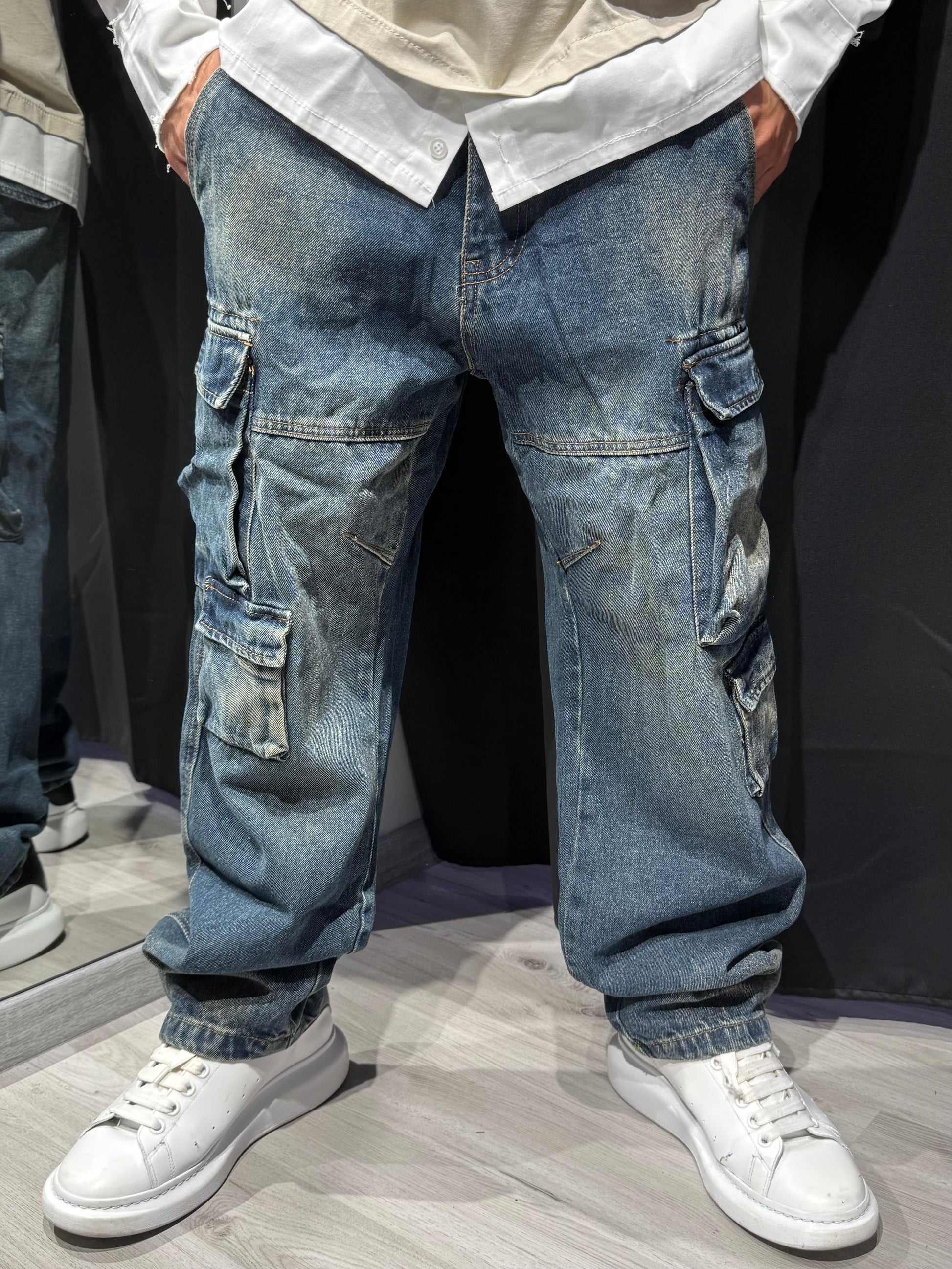 Pantalone cargo in denim con sfumature sabbiate e stile rilassato. Perfetto per outfit casual ma sempre originali