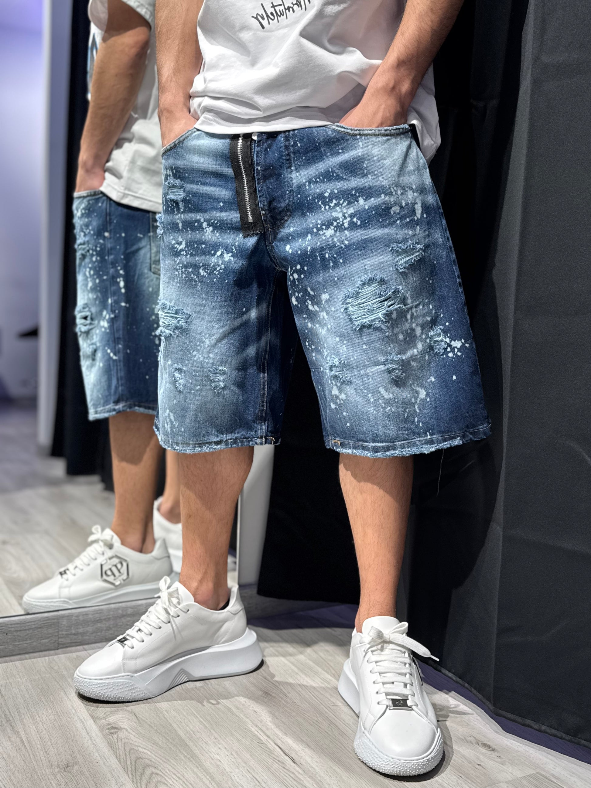 Jeans con schizzi di vernice effetto paint drop, lavaggio slavato e taglio Over.