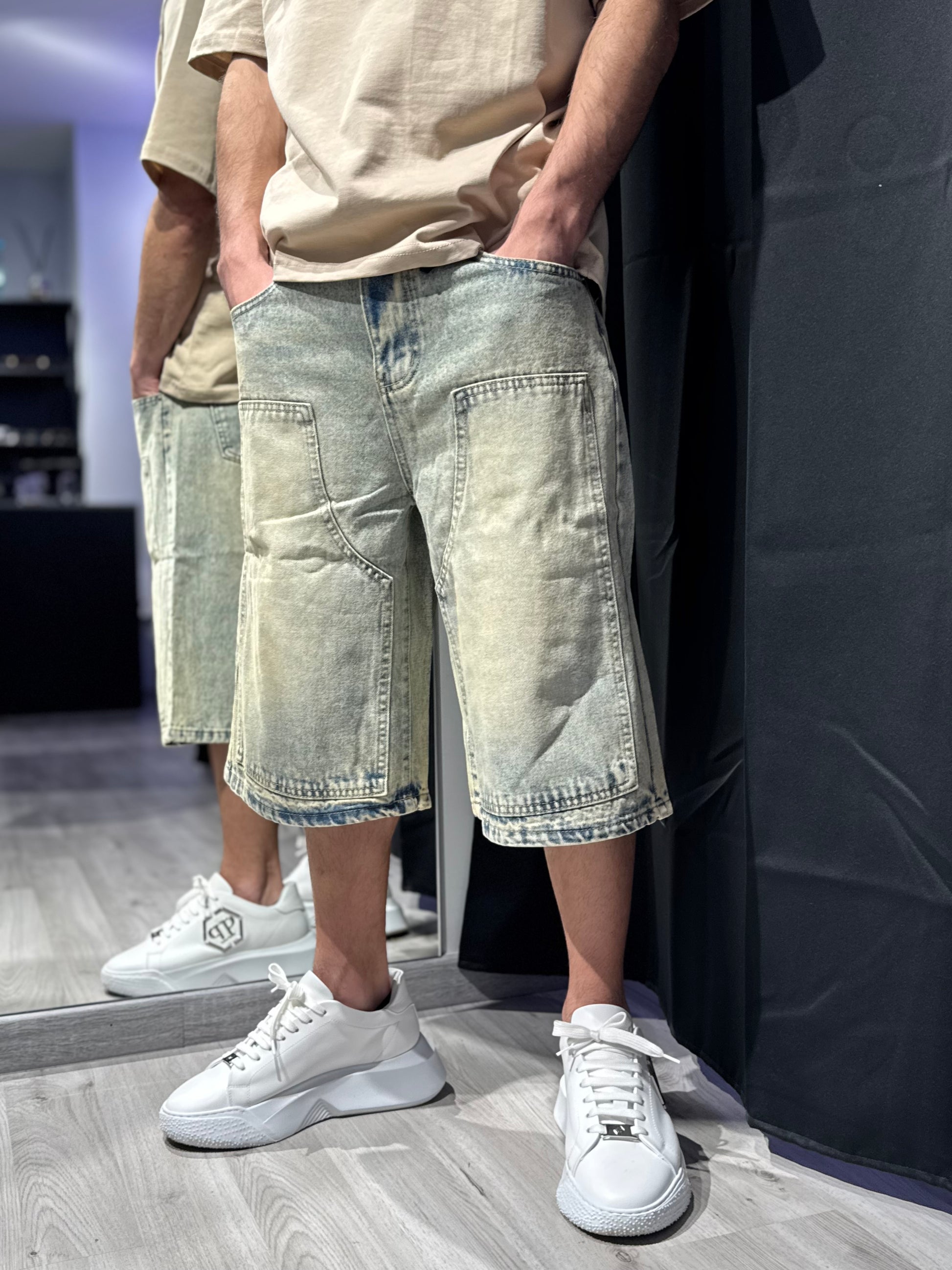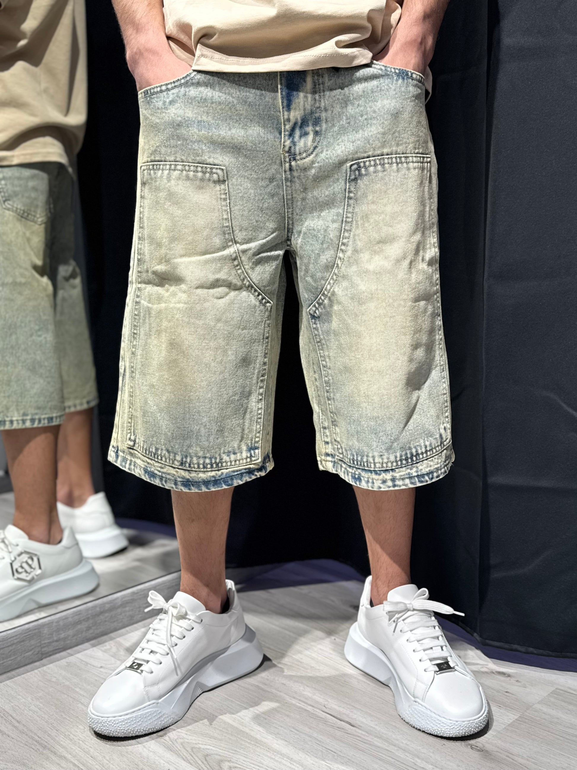 Jeans jorts con lavaggio sabbiato e cuciture robuste.