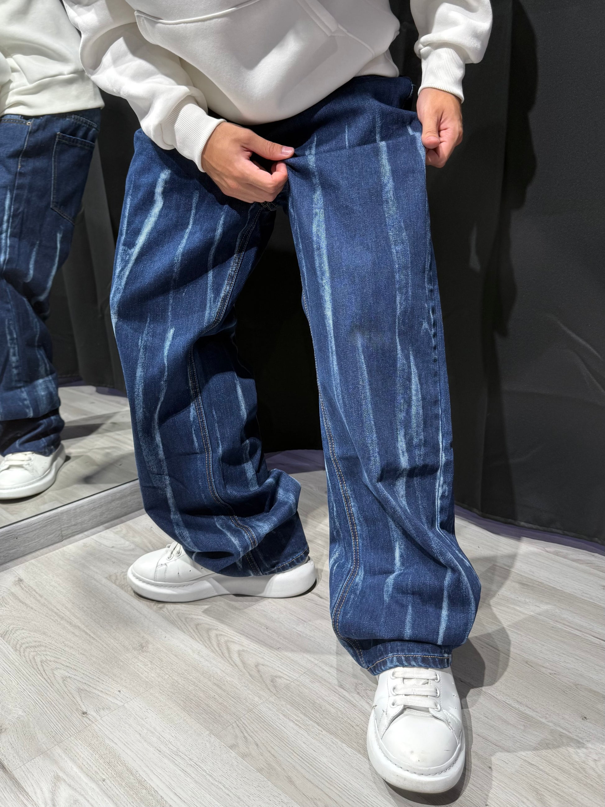 Jeans baggy blu con linee bianche sfumate in verticale. Comfort, stile oversize e dettagli unici per look street autentici