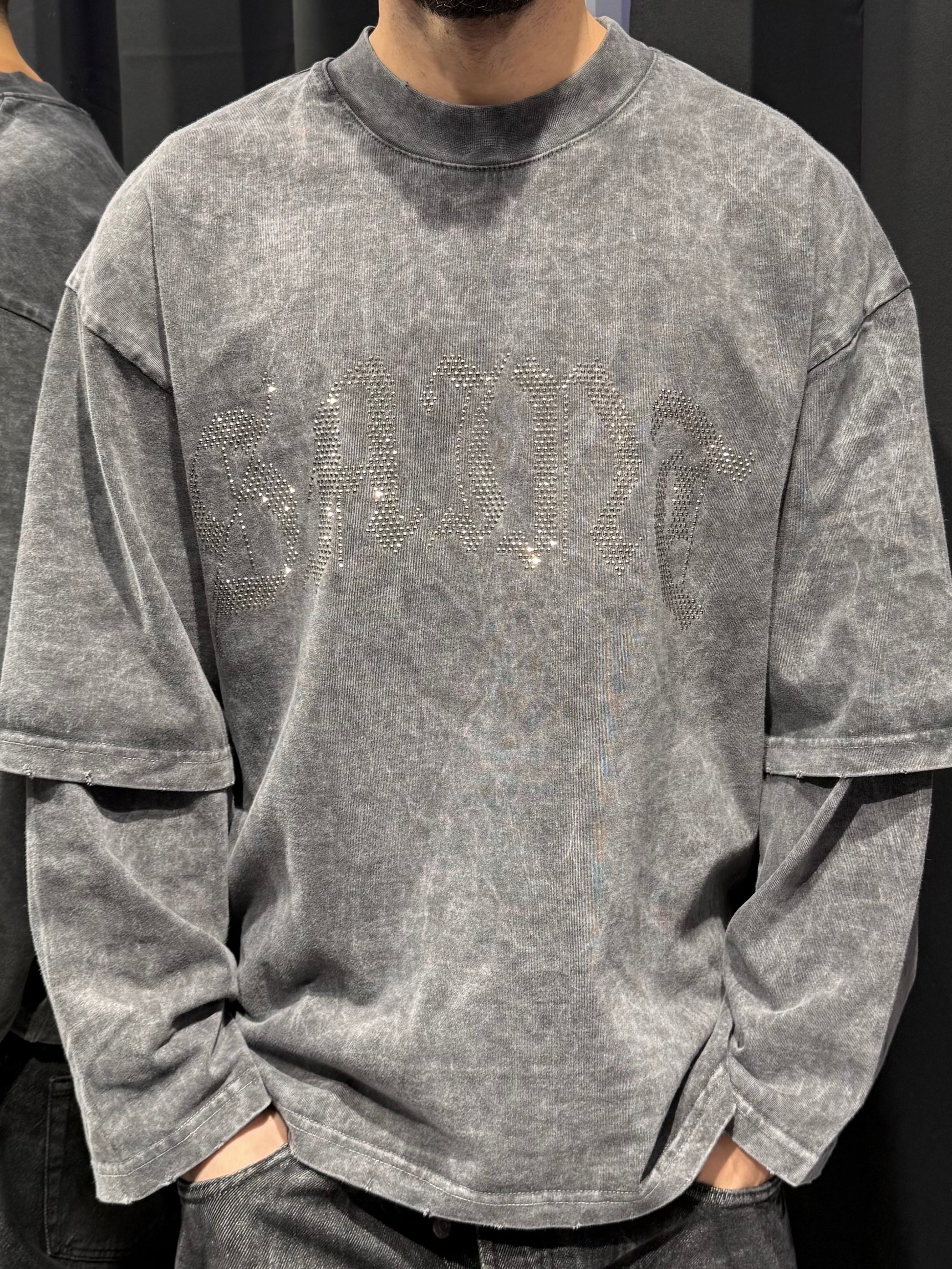La scritta “Saint” brillantinata è il punto focale del capo: luminosa, elegante e d’impatto, pensata per dare carattere alla maglia senza renderla eccessiva.