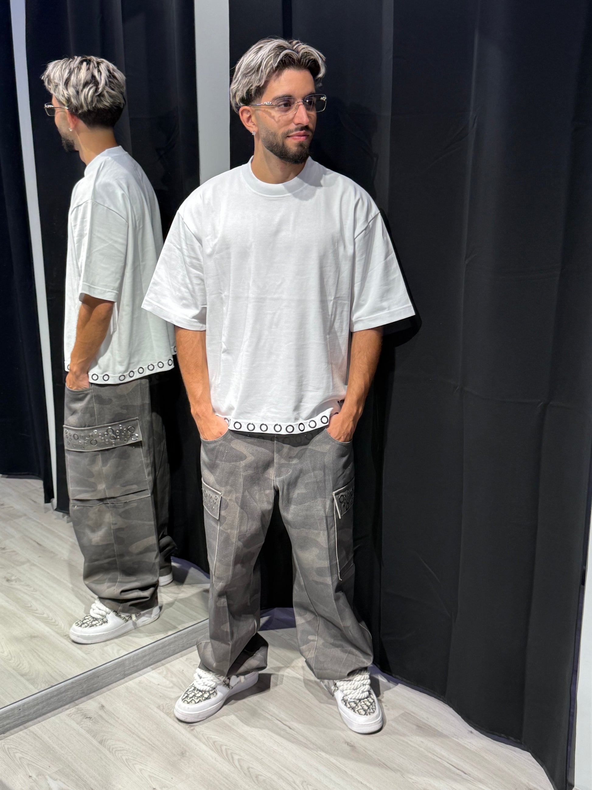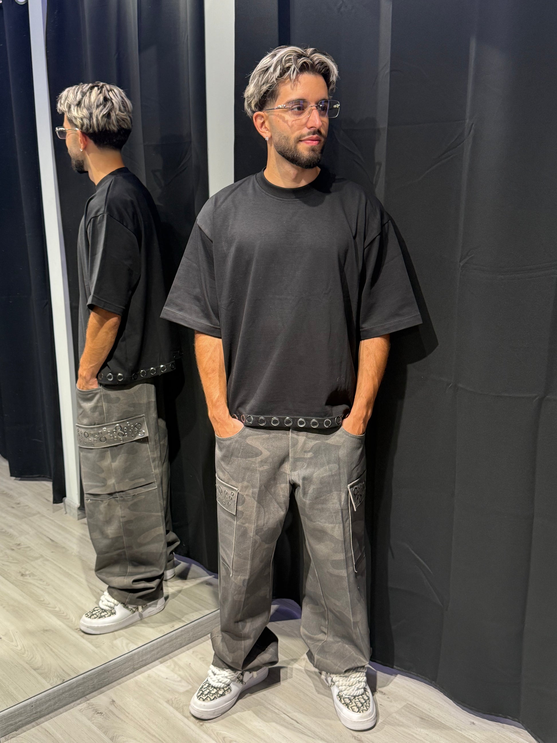 T-shirt modello crop con dettagli di borchie sul bordo inferiore: un mix perfetto tra minimal e ribelle. Comoda, versatile e dal carattere deciso, è il capo ideale per dare un tocco streetwear strong a qualsiasi outfit.