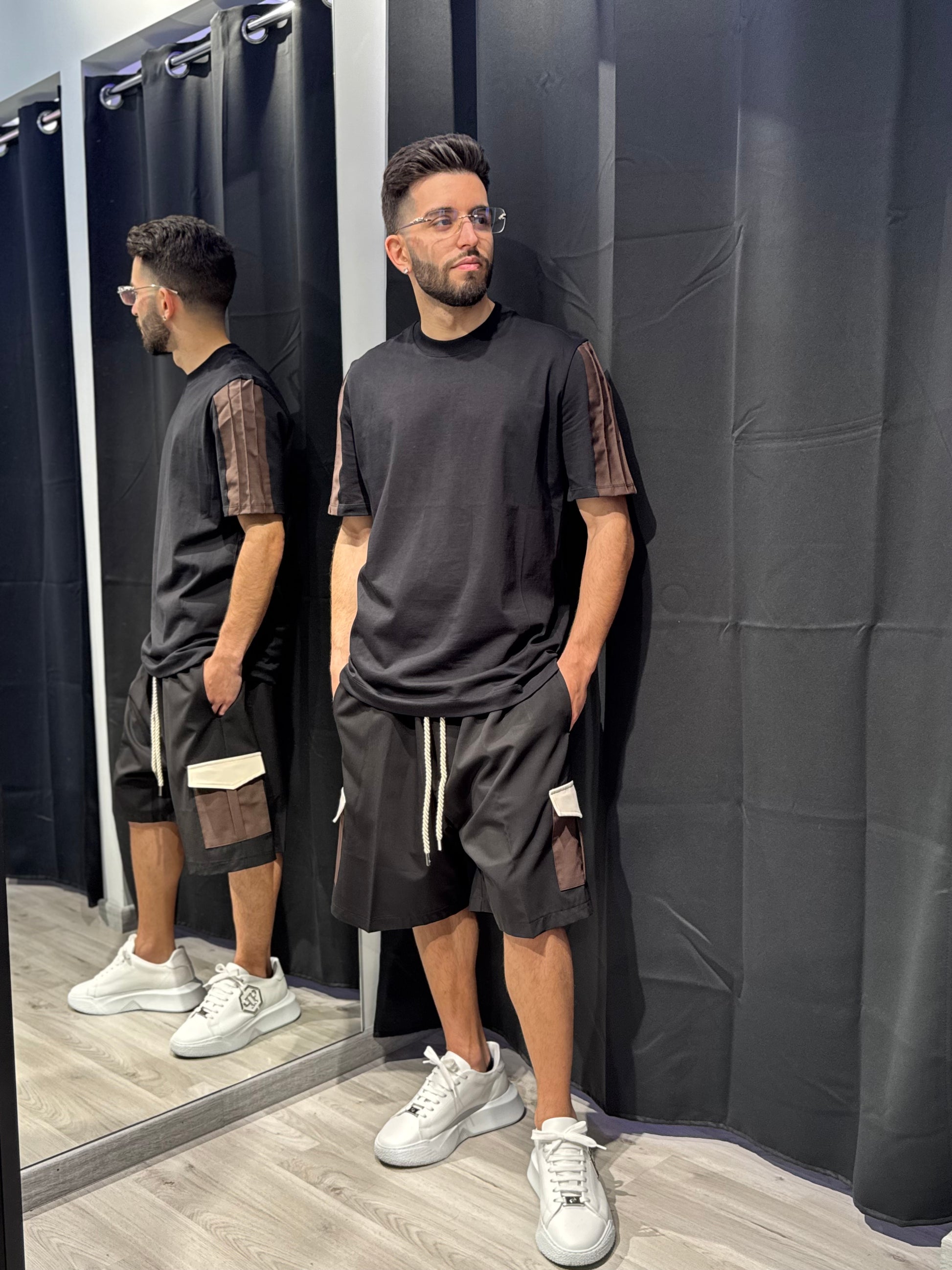 T-shirt dal taglio sartoriale con linee pulite sulle spalle e una striscia verticale sul retro che aggiunge movimento e stile.
