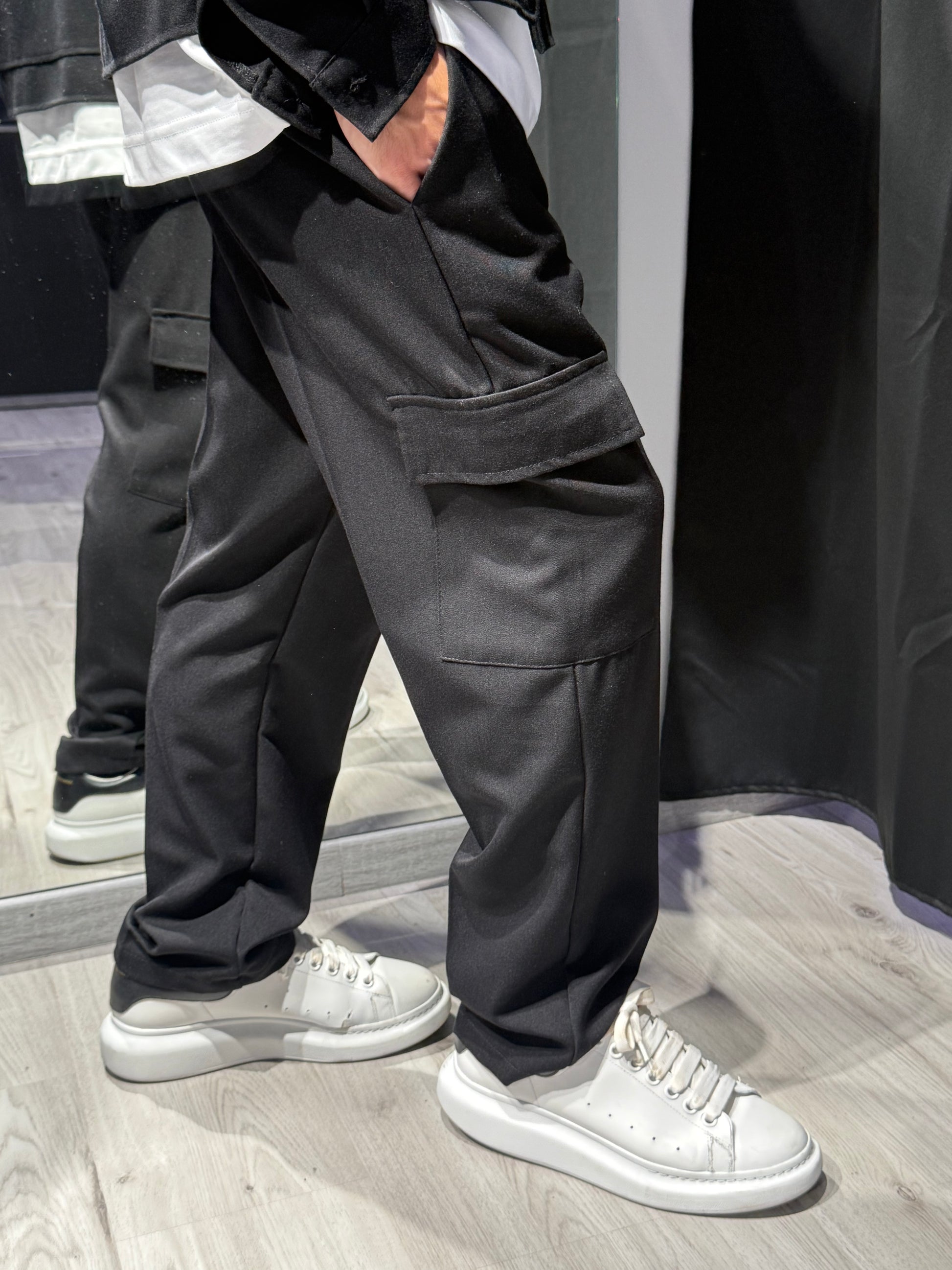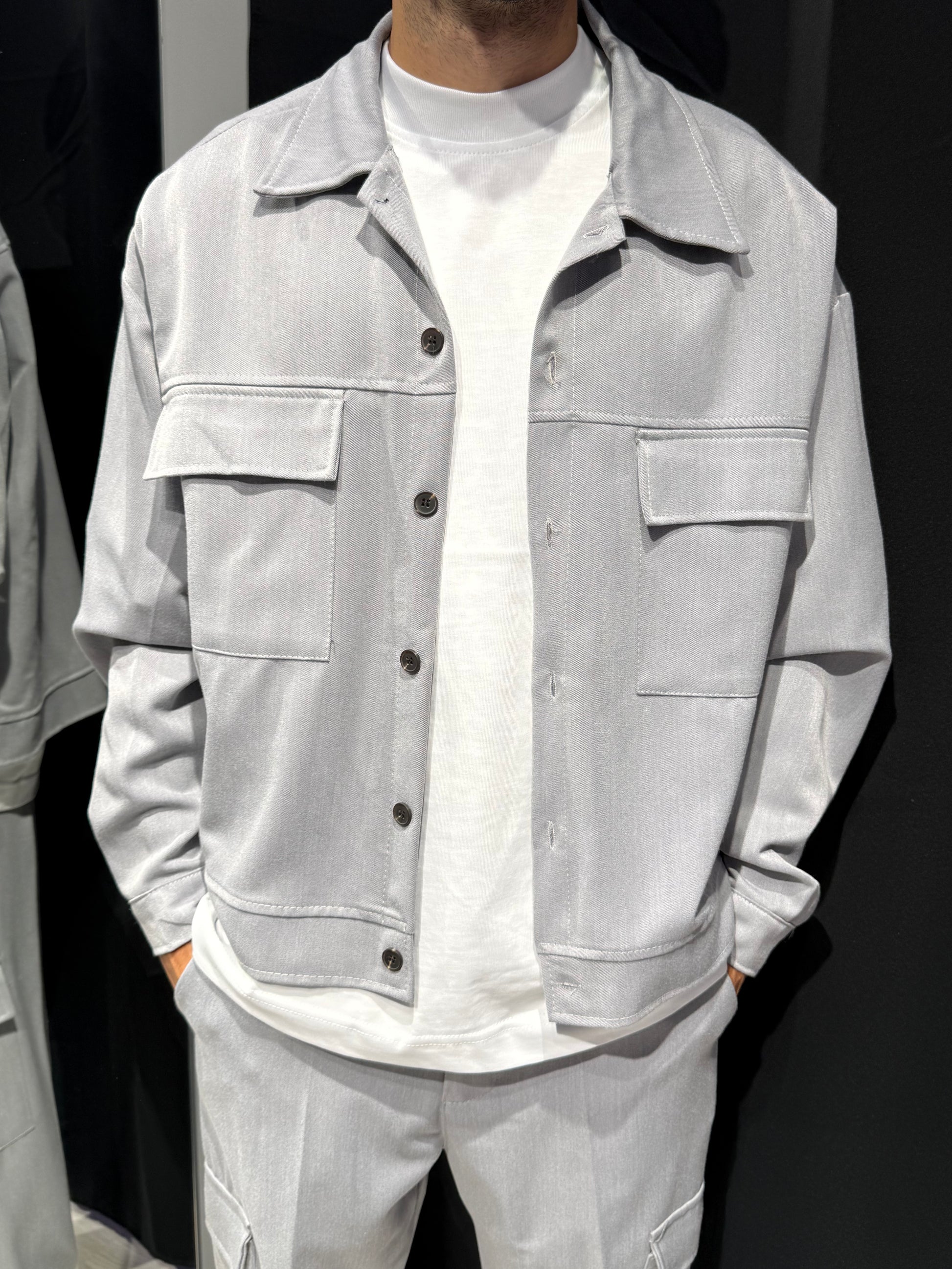 Coordinato dallo stile elegante-sportivo: pantalone modello cargo e giacca a bottoni per un look versatile che unisce comfort e raffinatezza streetwear.